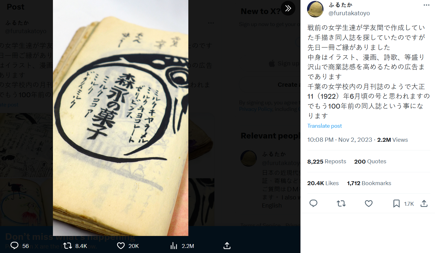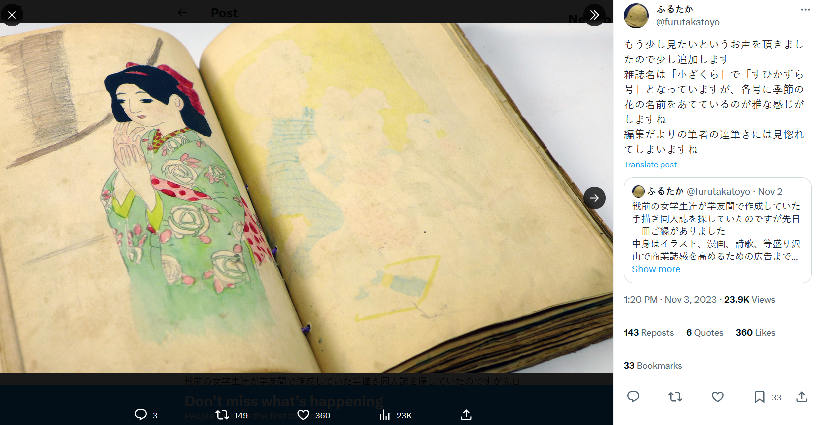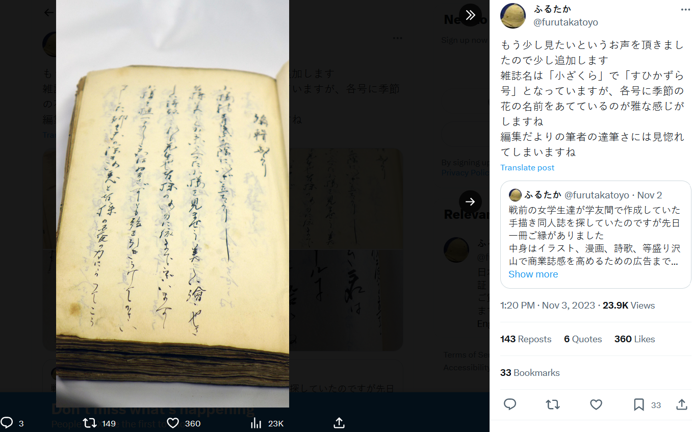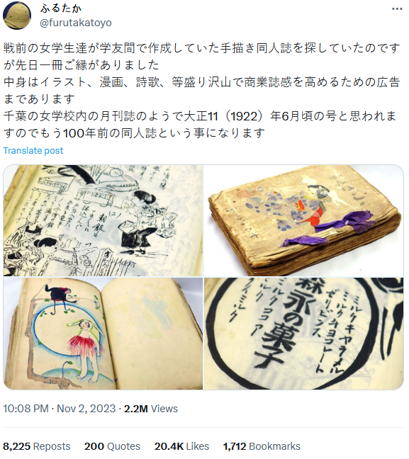 wolfenstein🐈⬛🎴 Nov 05, 2023 02:28AM "我在找戰前女學生學友們製作的手繪同人誌,前陣子終於找到一本。有插畫、漫畫、詩歌等豐富的內容,而且為了提昇商業雜誌感還做了廣告。這好像是千葉的女子學校的校內月刊的樣子,應該是大正11(1922)年6月發刊,所以已經是100年前的同人誌了。"