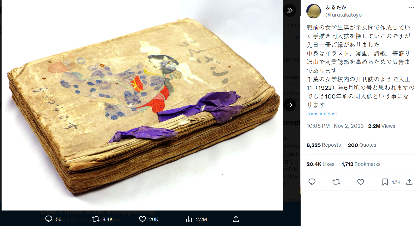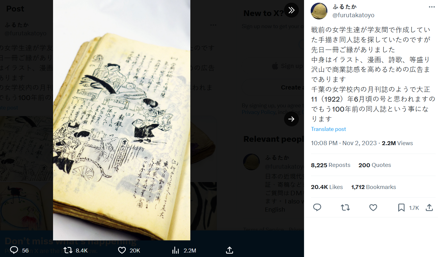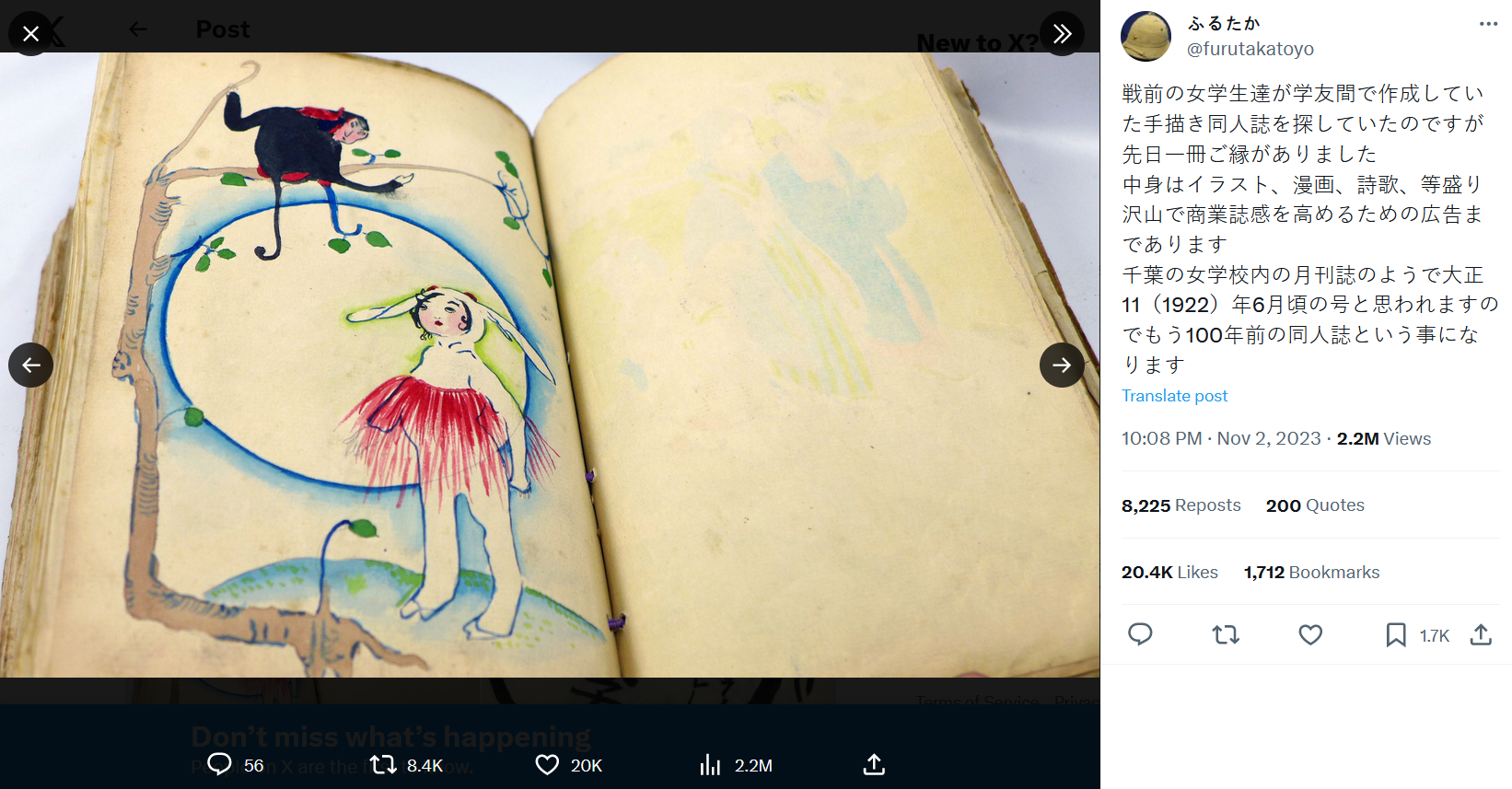 wolfenstein🐈⬛🎴 Nov 05, 2023 02:28AM "我在找戰前女學生學友們製作的手繪同人誌,前陣子終於找到一本。有插畫、漫畫、詩歌等豐富的內容,而且為了提昇商業雜誌感還做了廣告。這好像是千葉的女子學校的校內月刊的樣子,應該是大正11(1922)年6月發刊,所以已經是100年前的同人誌了。"