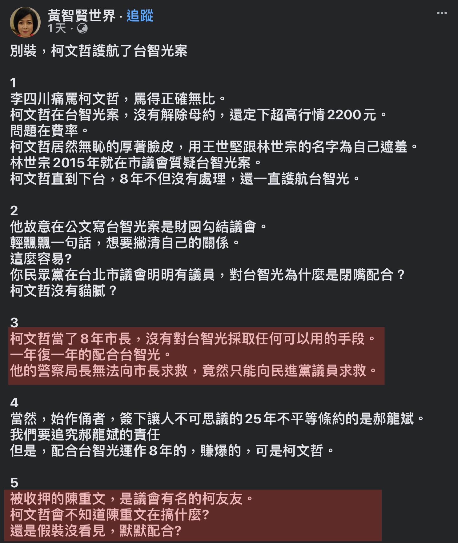 黃智賢:「柯文哲當了8年市長,沒有對台智光採取任何可以用的手段,一年復一年的配合台智光,他的警察局長無法向市長求救,竟然只能向民進黨議員求救」、「被收押的陳重文,是議會有名的柯友友,柯文哲會不知道陳重文在搞什麼?還是假裝沒看見,默默配合?」
