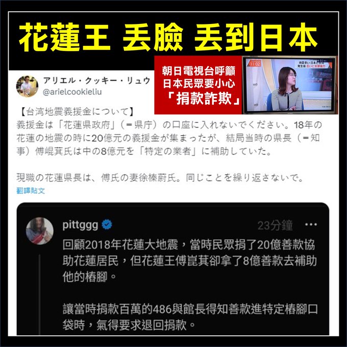 花蓮王,丟臉,丟到日本了!朝日電視台的新聞,一位女性來賓呼籲日本民眾要小心「詐騙詐騙」。