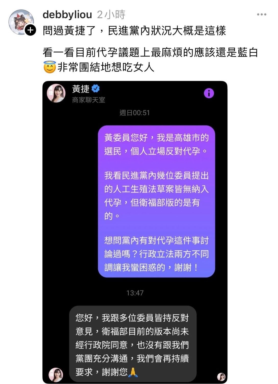 黃捷並不是反對代理孕母,而是反對衛福部推出的代孕草案細項吧,不然黃捷先前在公聽會講的這串話能叫做反對(代孕)嗎?