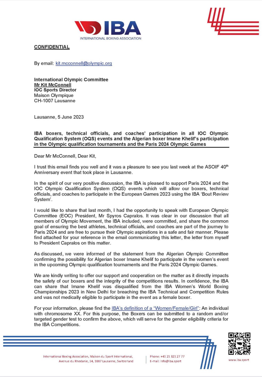Khelif and Lin were informed accordingly about the decision and acknowledged it by signing the papers. The test details were attached to the letter.