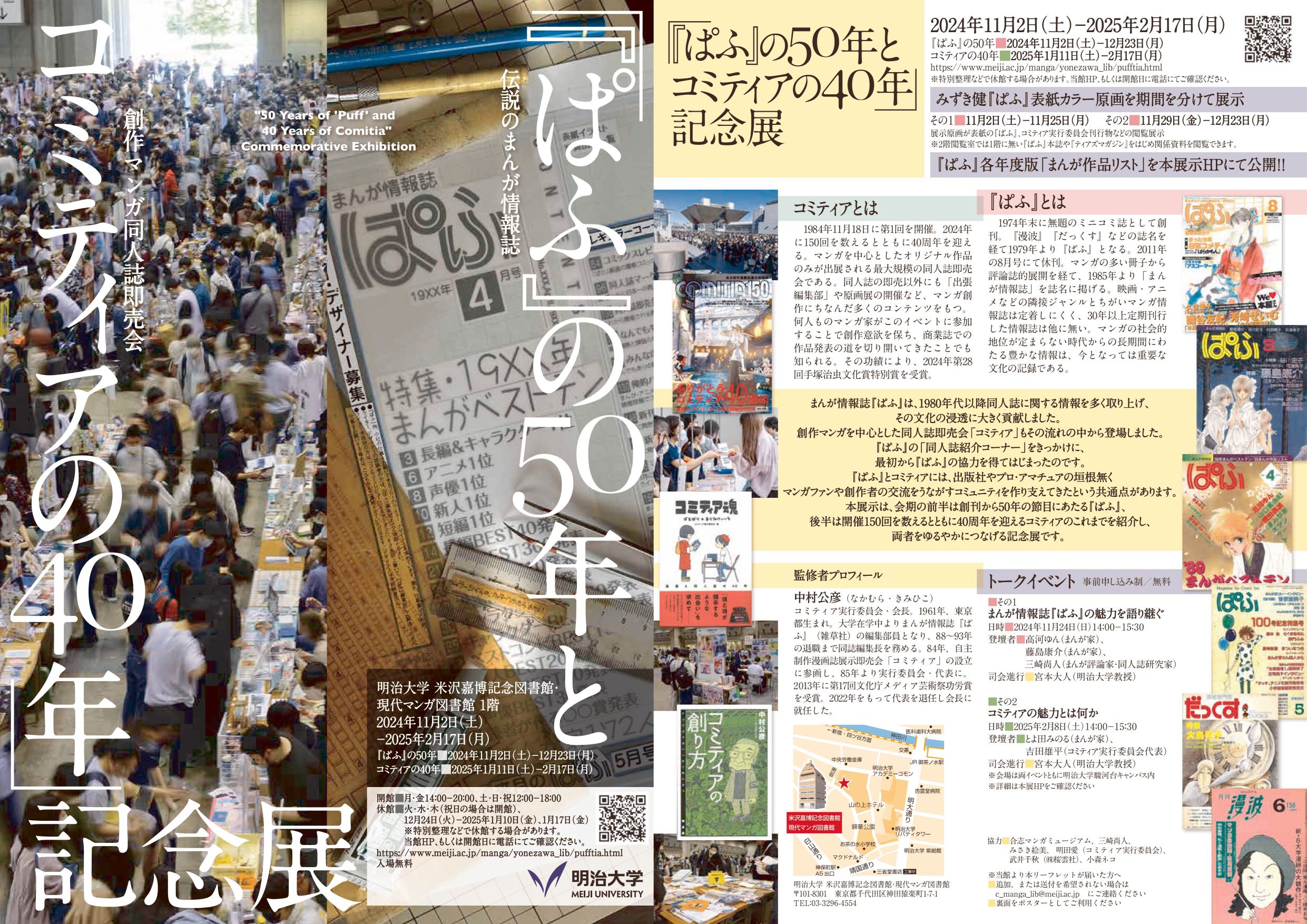 1974年創刊(改過幾次刊名)、2011年停刊的漫畫情報誌〈Puff〉對於提供漫畫資訊、推動同人文化有重大貢獻,這次明治大學的回顧展特別將它從1982年開始對前一年度各家雜誌刊載的漫畫作品清單(不是只收單行本出版,而是按雜誌刊載紀錄整理)掃描公開,對於漫畫愛好者研究(特別是尋找單行本未收錄作品)有重大幫助