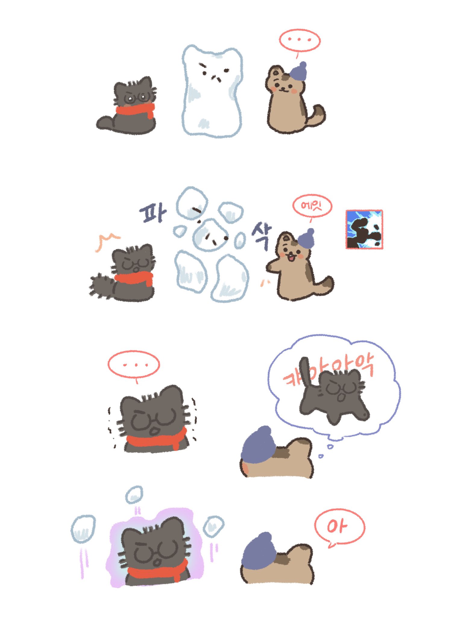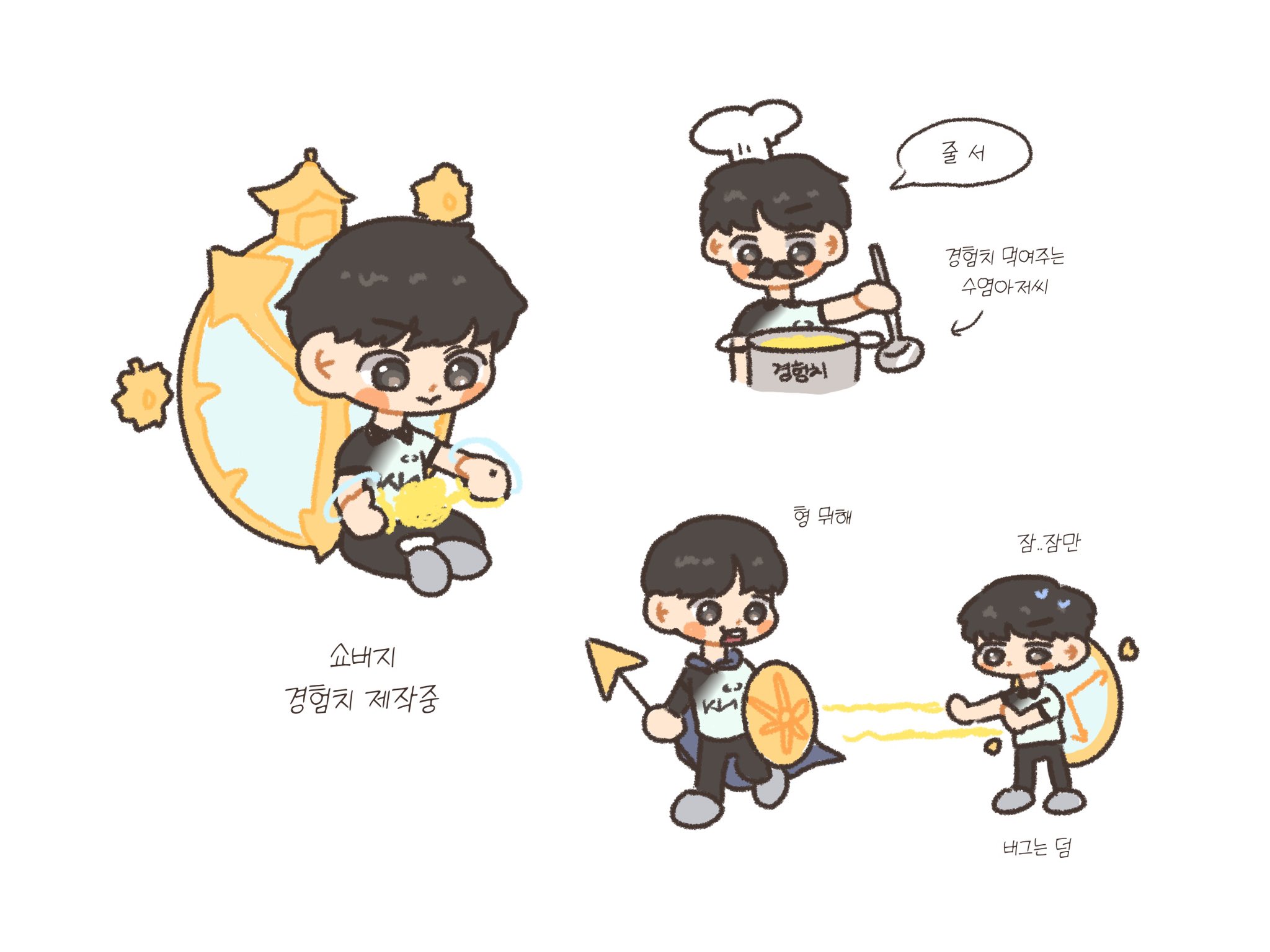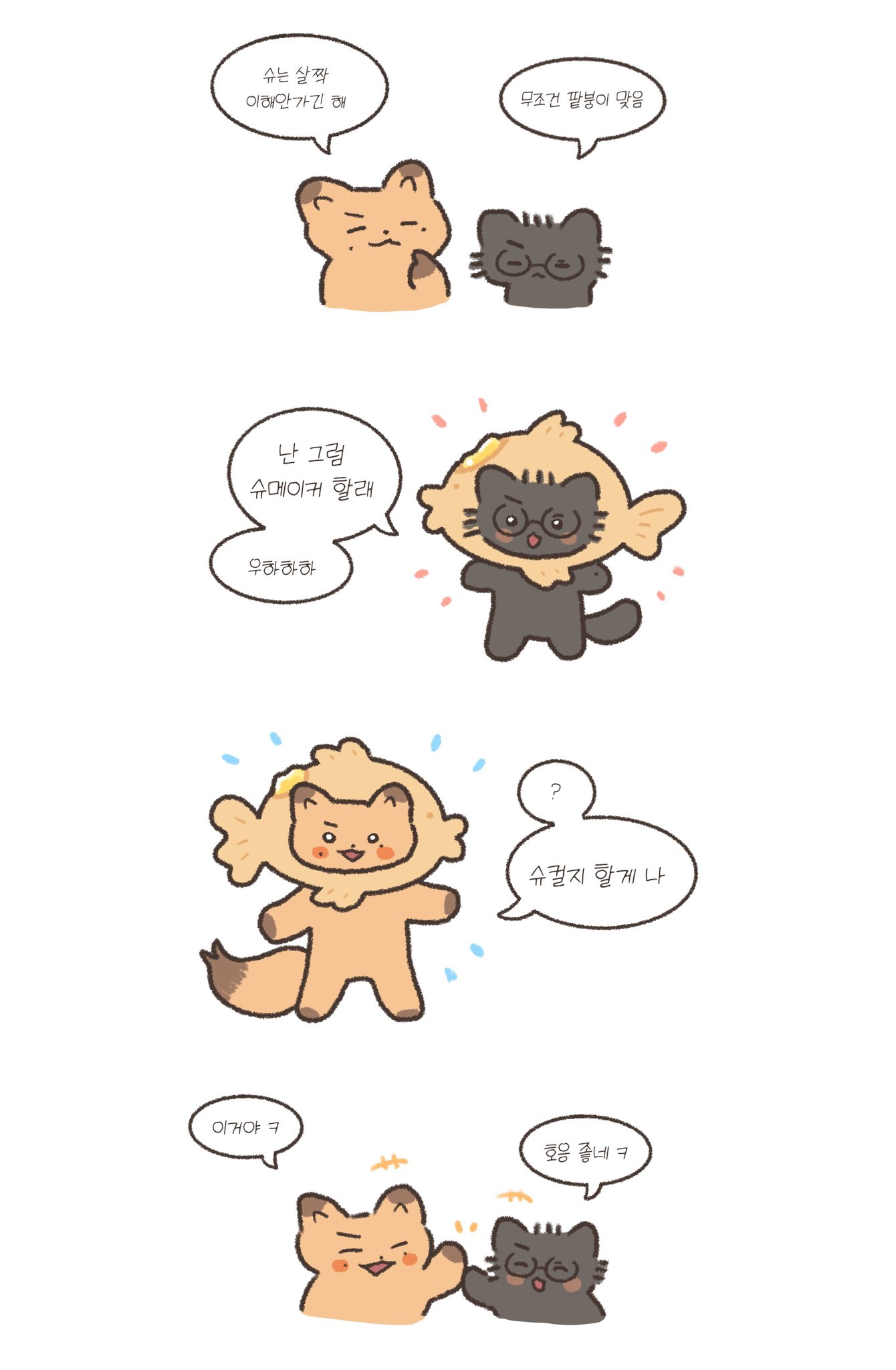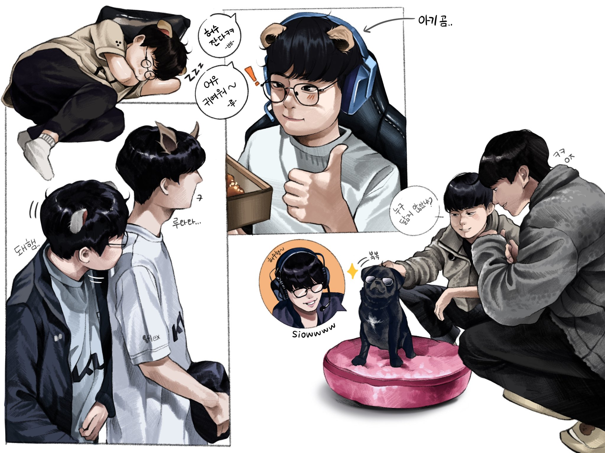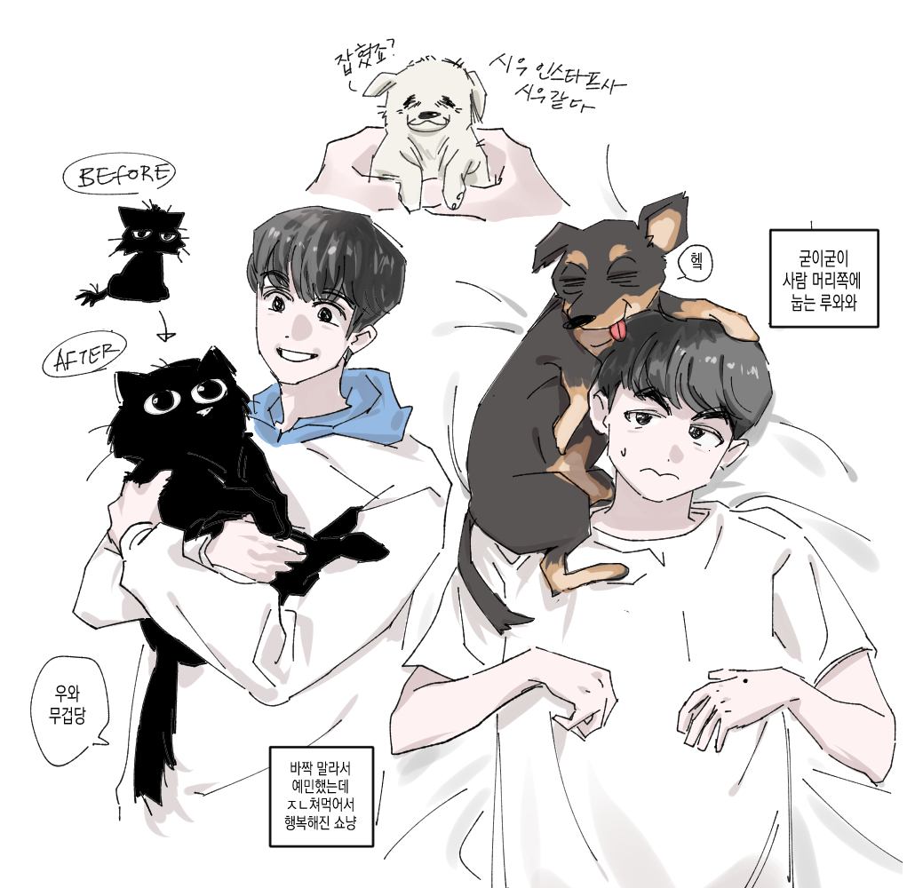 許秀摸著로제說「용혁이」容赫蹲下來就說「허수 귀여워」邊摸호빵