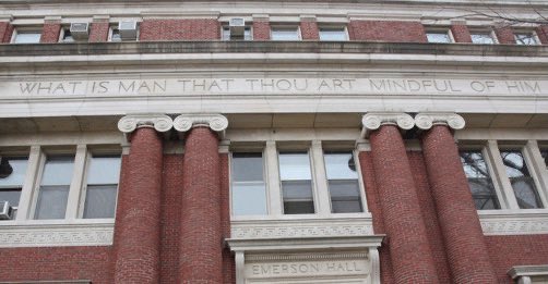 『100年前,哈佛還是新教徒專制的時候,校領導曾經把一句警醒、諷刺的話刻在了哈佛哲學系大樓上(如圖)「世人算什麼,你竟顧念他」。這是聖經的話。