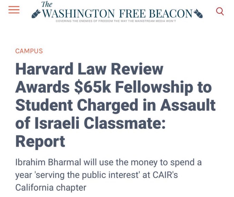 BREAKING: Harvard just awarded Ibrahim Bharmal—a student charged with assaulting a Jewish classmate—a $65,000 fellowship to work for CAIR.