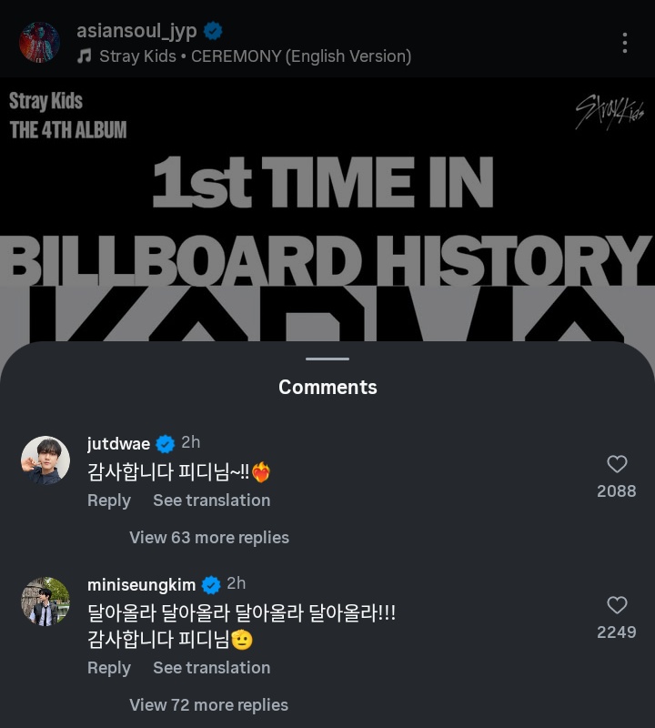 Changbin 창빈 Global🌟 (@ChangbinGlobal) on X玟彬都在JYP祝賀的IG貼文下留言