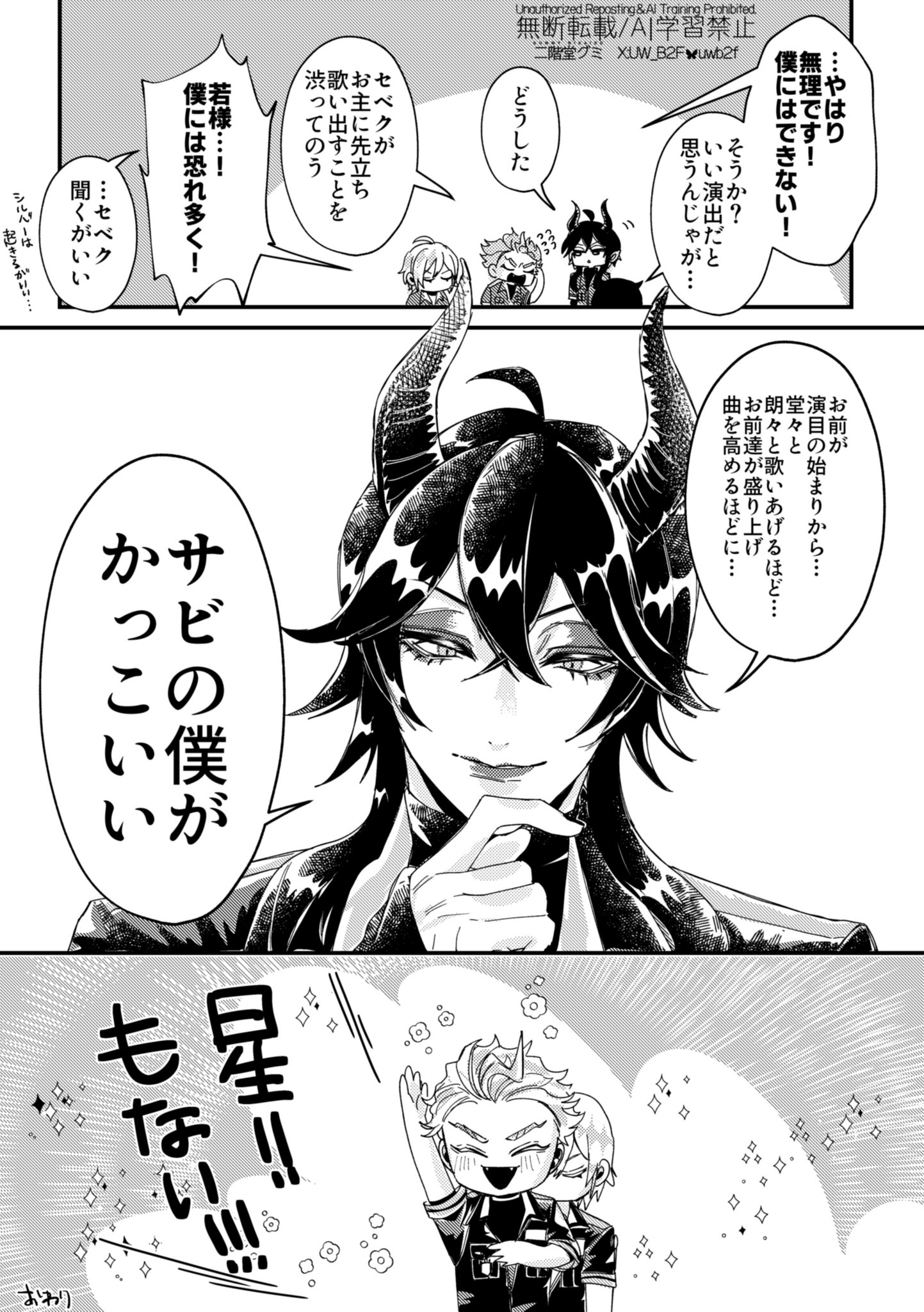 然後我一直想到ノア的裁きの雷,這次用出來的是小馬,這篇的馬王的威嚴感好強,太強大了甚至讓人看一眼就燃起希望,在逼供到別人噴水那邊他蹲下來的描述又好可愛(也好可怕)整個語無倫次欸但就像看大電影一樣