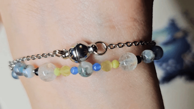 另外這些都是以碎片的方式延伸至後方的綠色,像是戰爭打壞了森林的寧靜安穩,所以綠色聚集在第二圈不鏽鋼的細鍊上以及後半圈,另外一個印象點是森林中可愛的木靈,所以我將水草瑪瑙穿過細鍊,可以自由滑動,源源半透明的姿態便很像木靈。