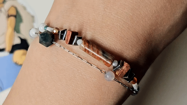 礦石:戰國瑪瑙、礫背蛋白石、鐵膽石、水草瑪瑙、紅瑪瑙、彼得石、綠松石、白月光、綠磷輝、MIYUKI白色管珠