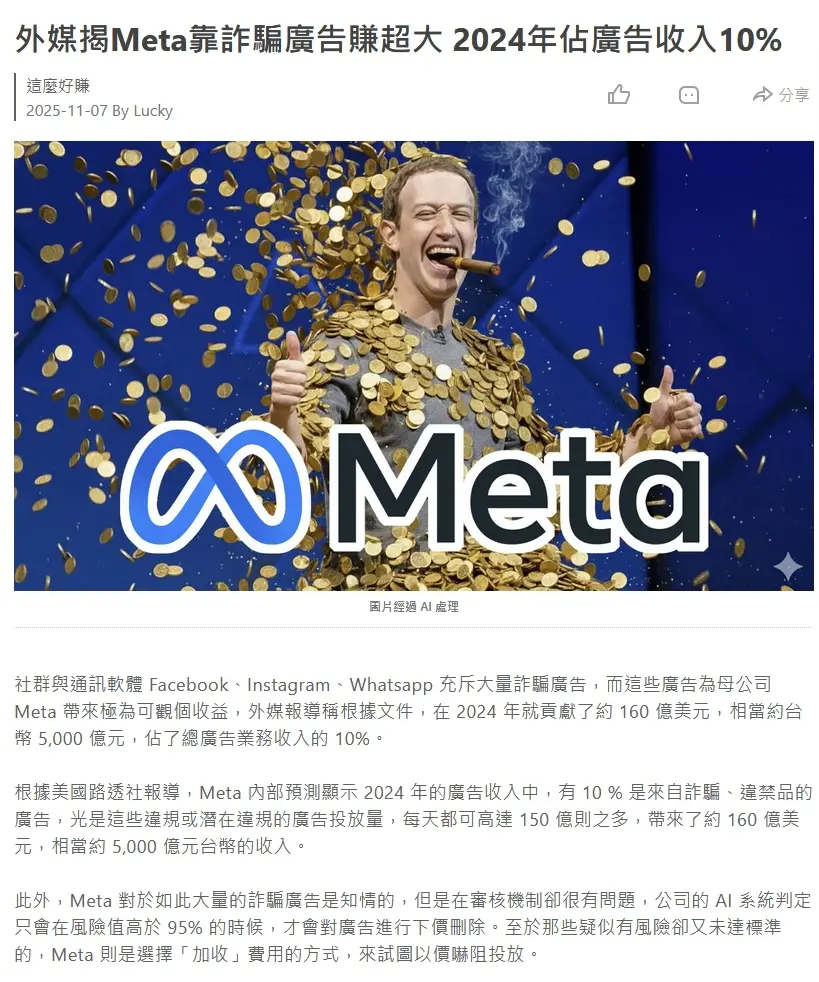 外媒揭Meta靠詐騙廣告賺超大 2024年佔廣告收入10%