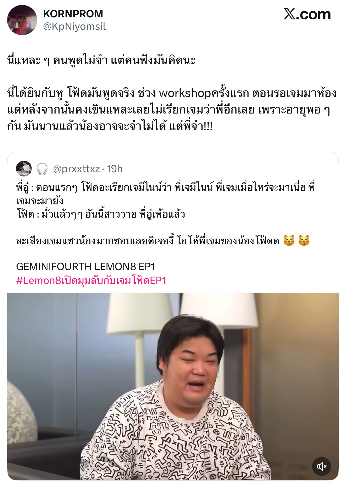 P'Au:就是這樣。說這話的人可能會忘記,但聽到的人會一直想著。我親耳聽到的。Fourth在第一次工作坊的時候,等Gem來房間的時候,真的說過這句話。但之後他可能害羞了,所以就再也沒叫過Gem“phi”,因為他們年紀差不多。時間過去很久了,Nong可能已經不記得了,但我記得! ! !
