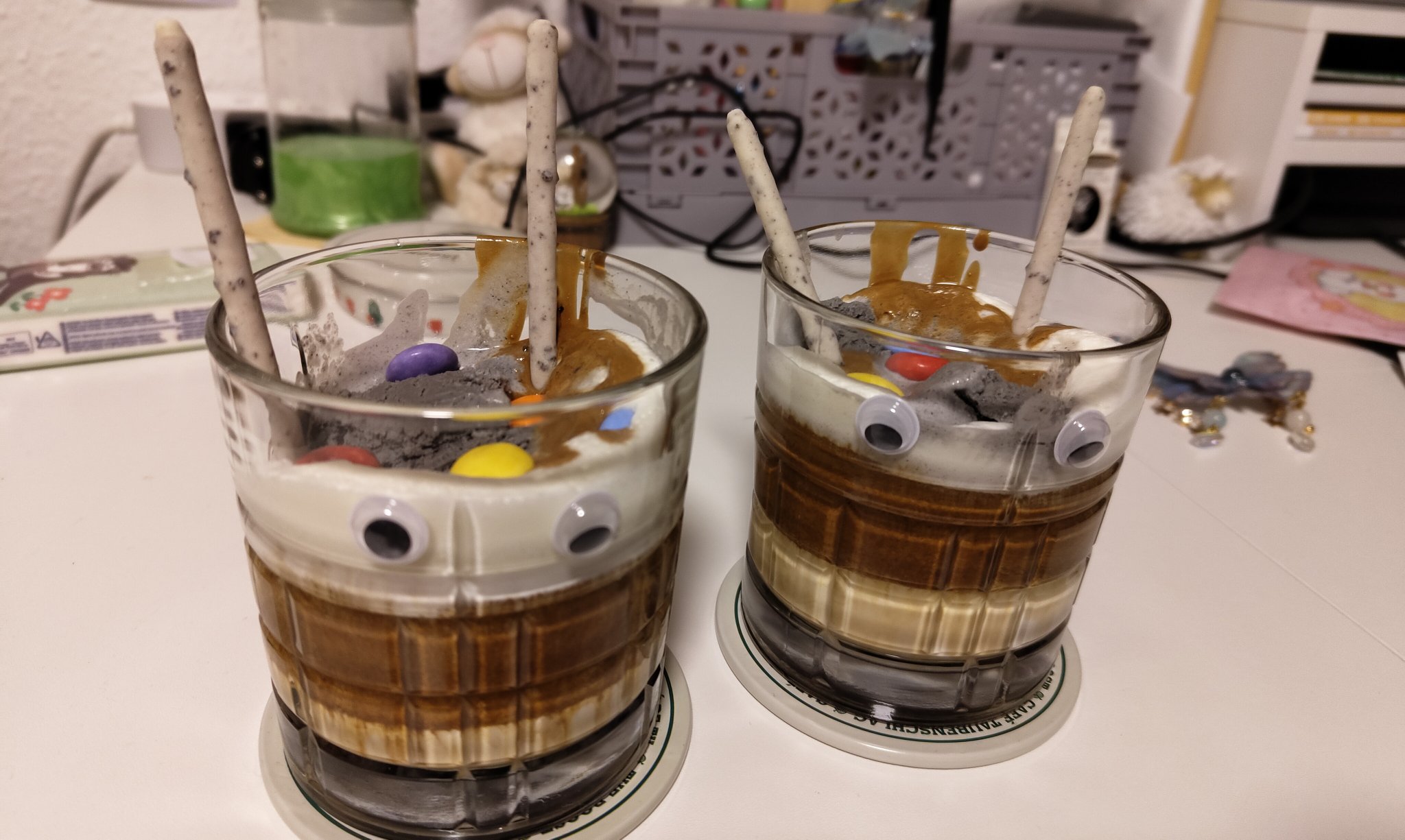 I was a Maid for my Birthday! - Oshiete Yo Cú-Sensei...開始設計蛹者主題的雞尾酒和無酒精調飲,老師的設計概念是土石流(mudslide)調酒,因為它口感濃郁綿密,顏色也是棕色的,但是伏特加味道太強烈了,老師覺得使用奶酒或雙份鮮奶油當基底就可以。中層是咖啡利口酒/400次咖啡(Dalgona coffee),上層則是一球黑芝麻或巧克力冰淇淋,再用蛹者的五色M&M巧克力或其他東西做裝飾。