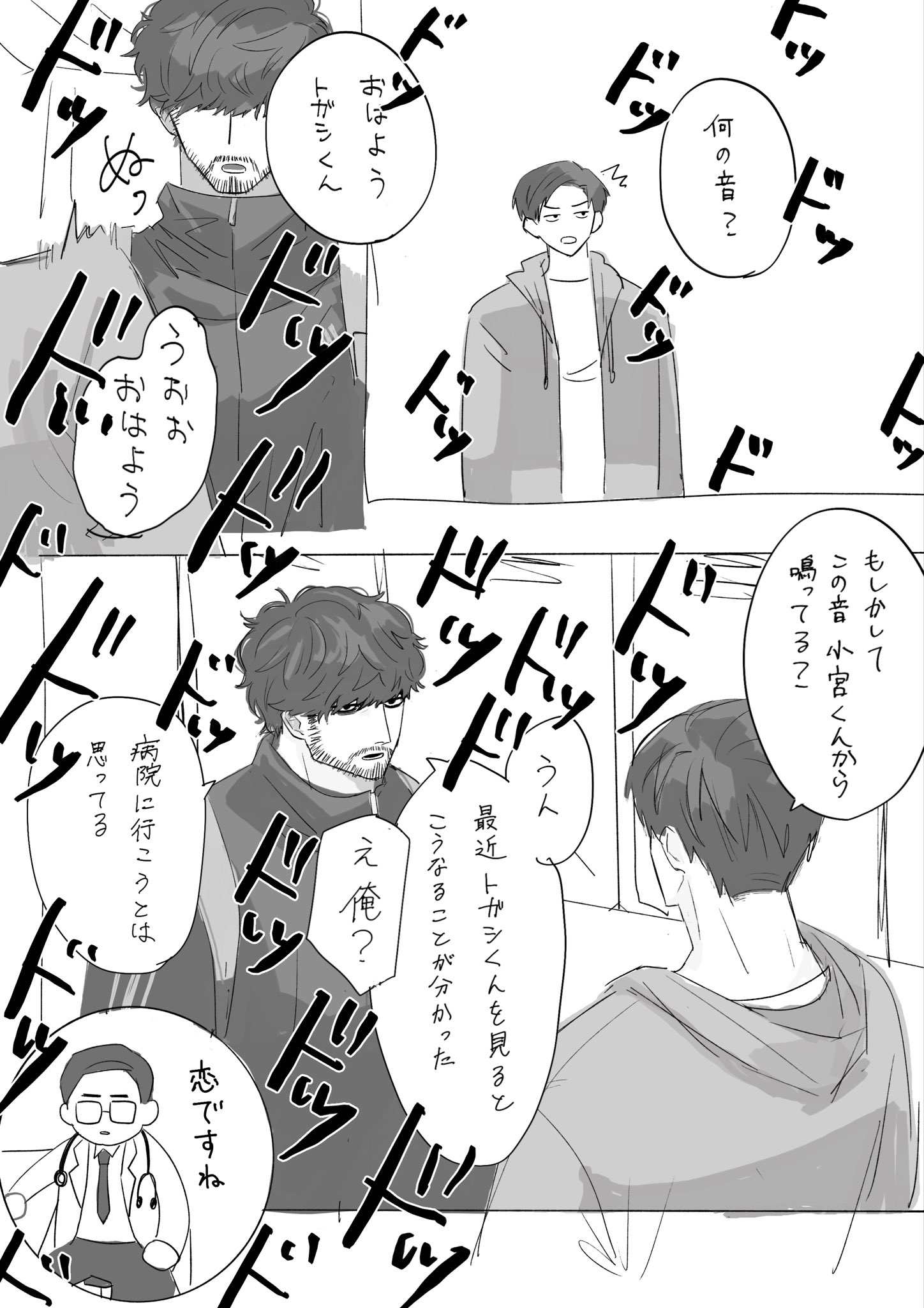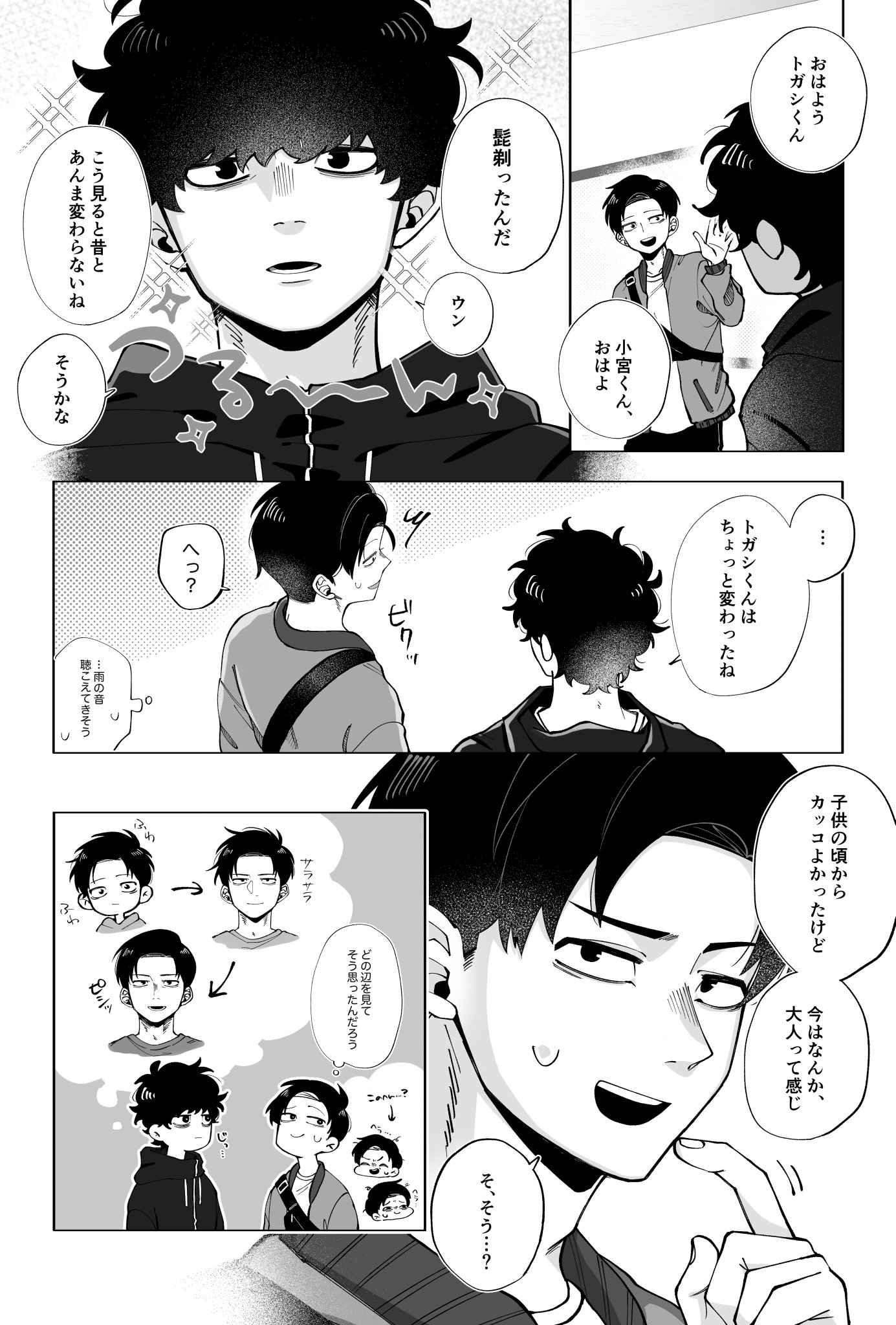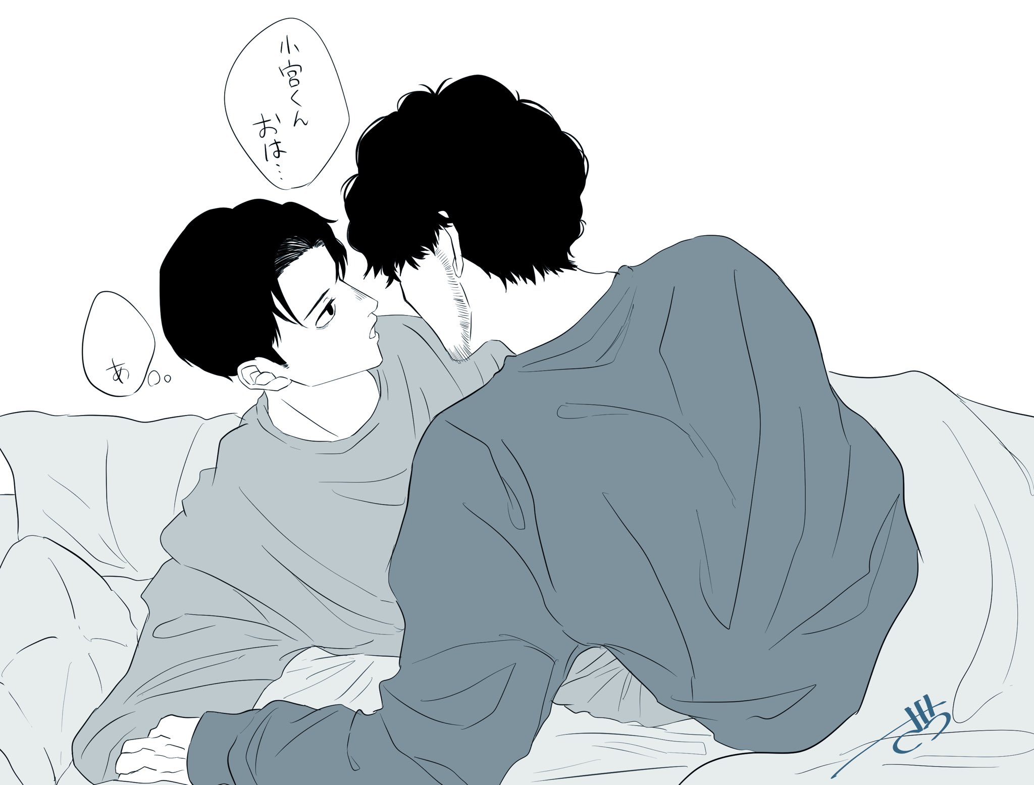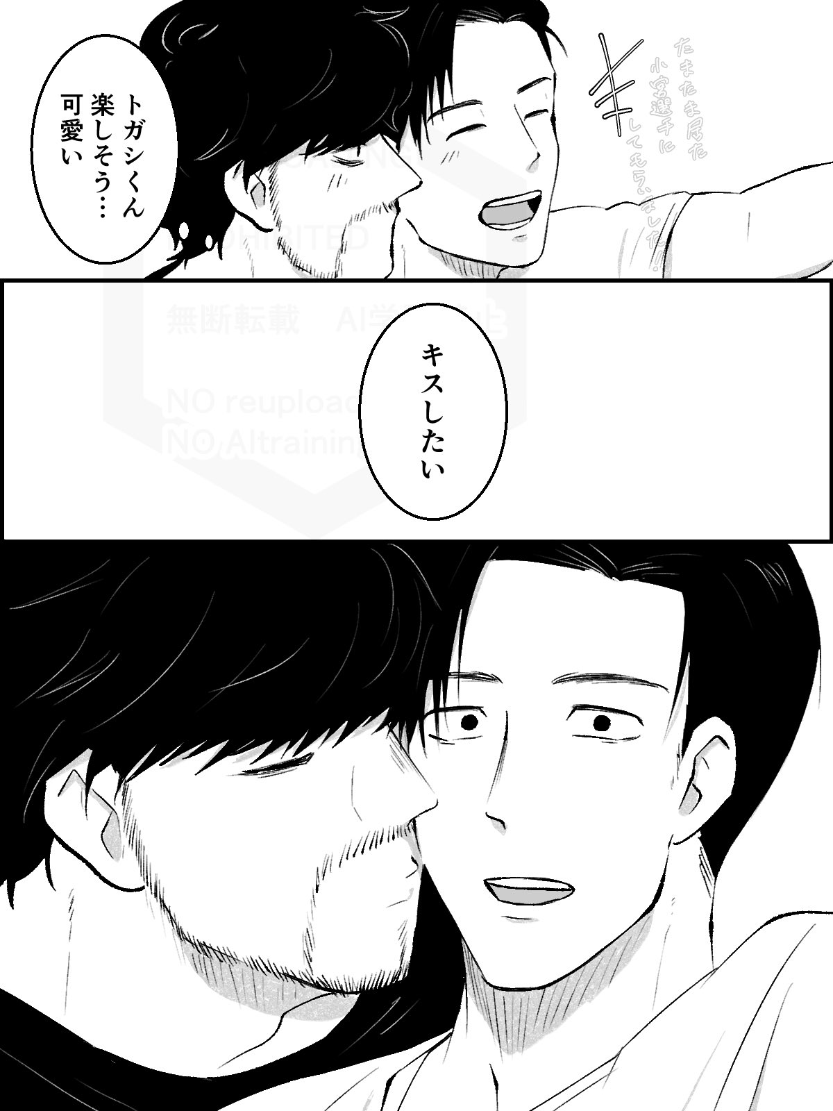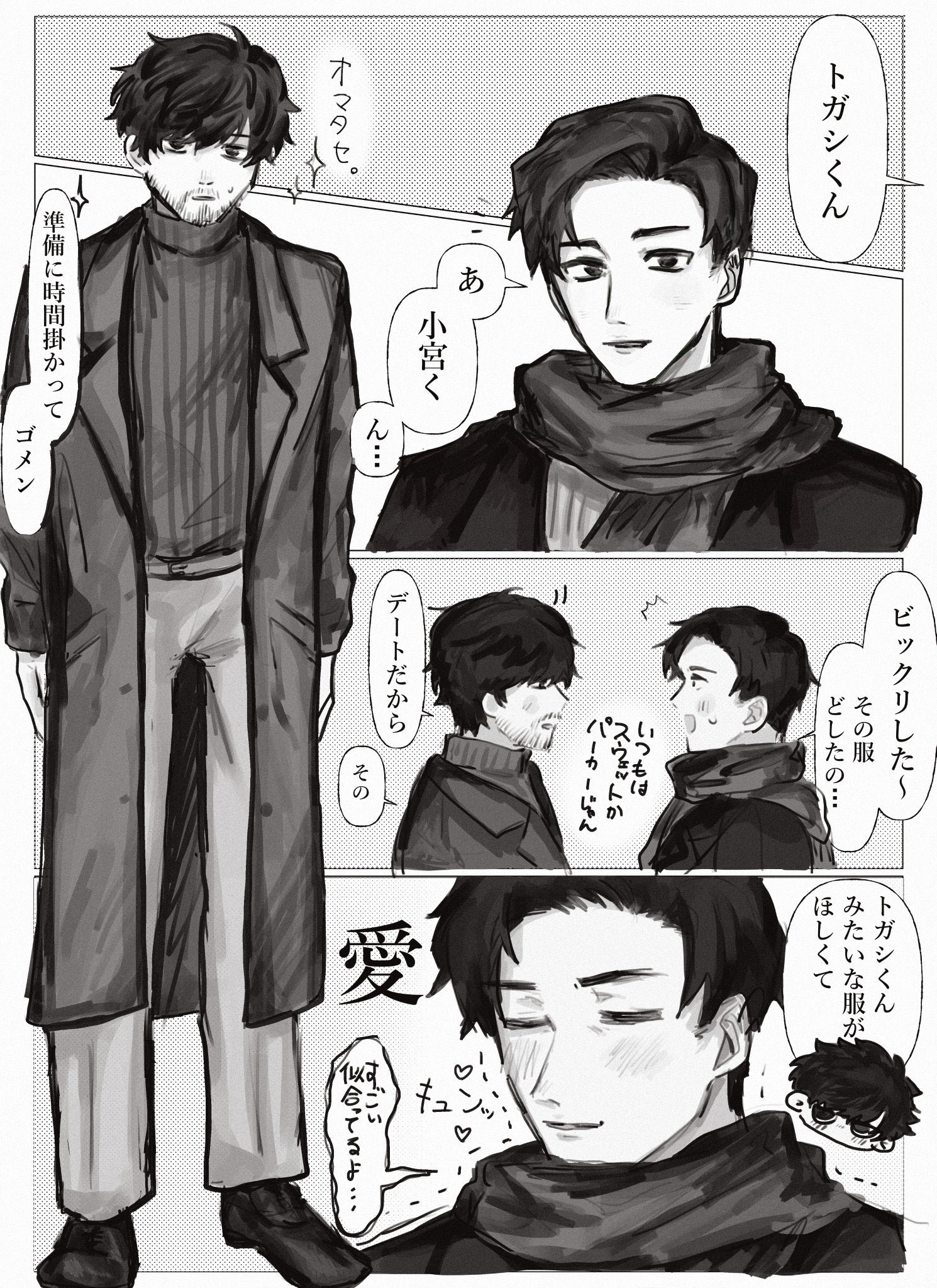 「ふーん?」トガシ揚起眉頭,「小宮くん你有好好回應人家嗎?」「うん。」「真乖。」語畢,他親暱的搓了搓小宮的頭髮。
