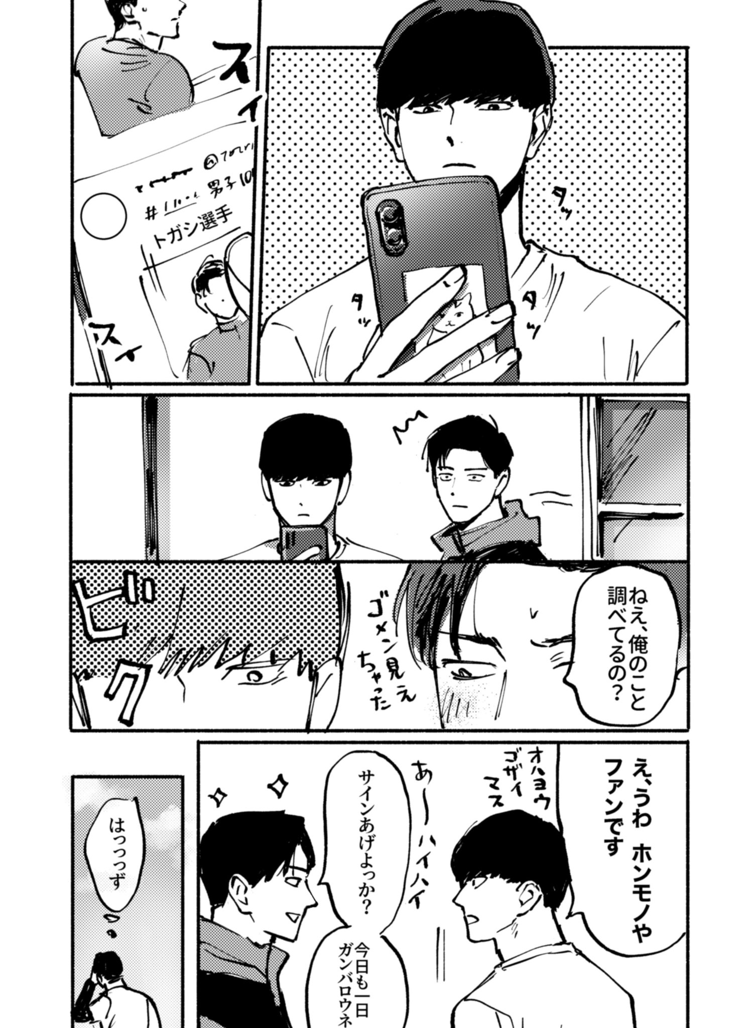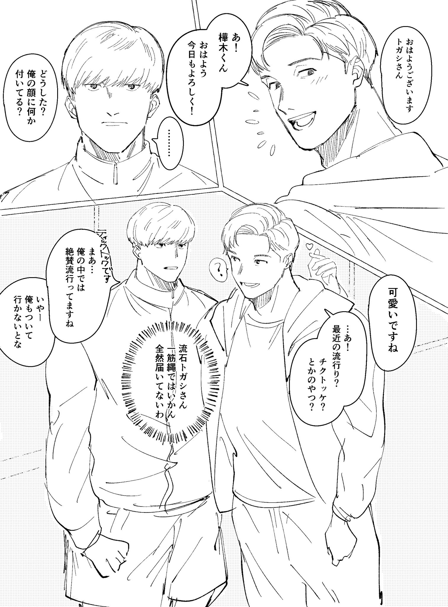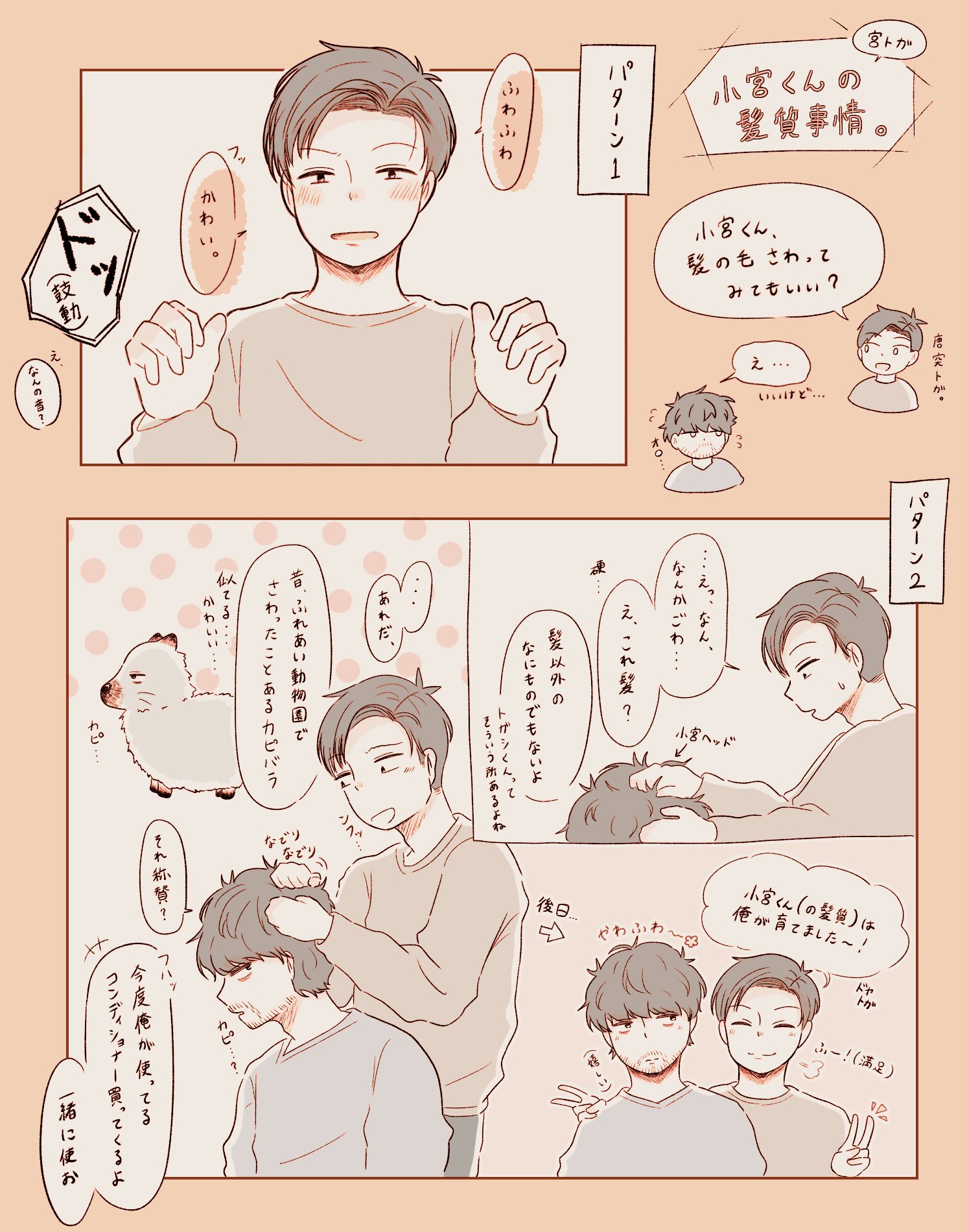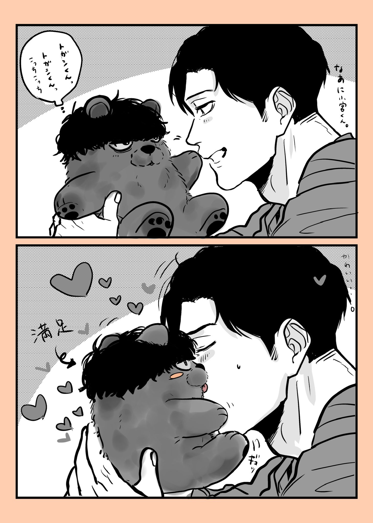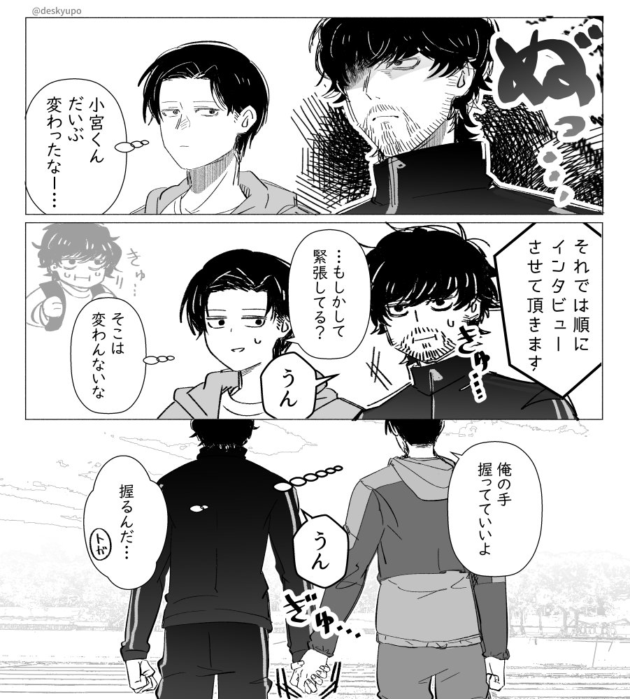 「ふーん?」トガシ揚起眉頭,「小宮くん你有好好回應人家嗎?」「うん。」「真乖。」語畢,他親暱的搓了搓小宮的頭髮。
