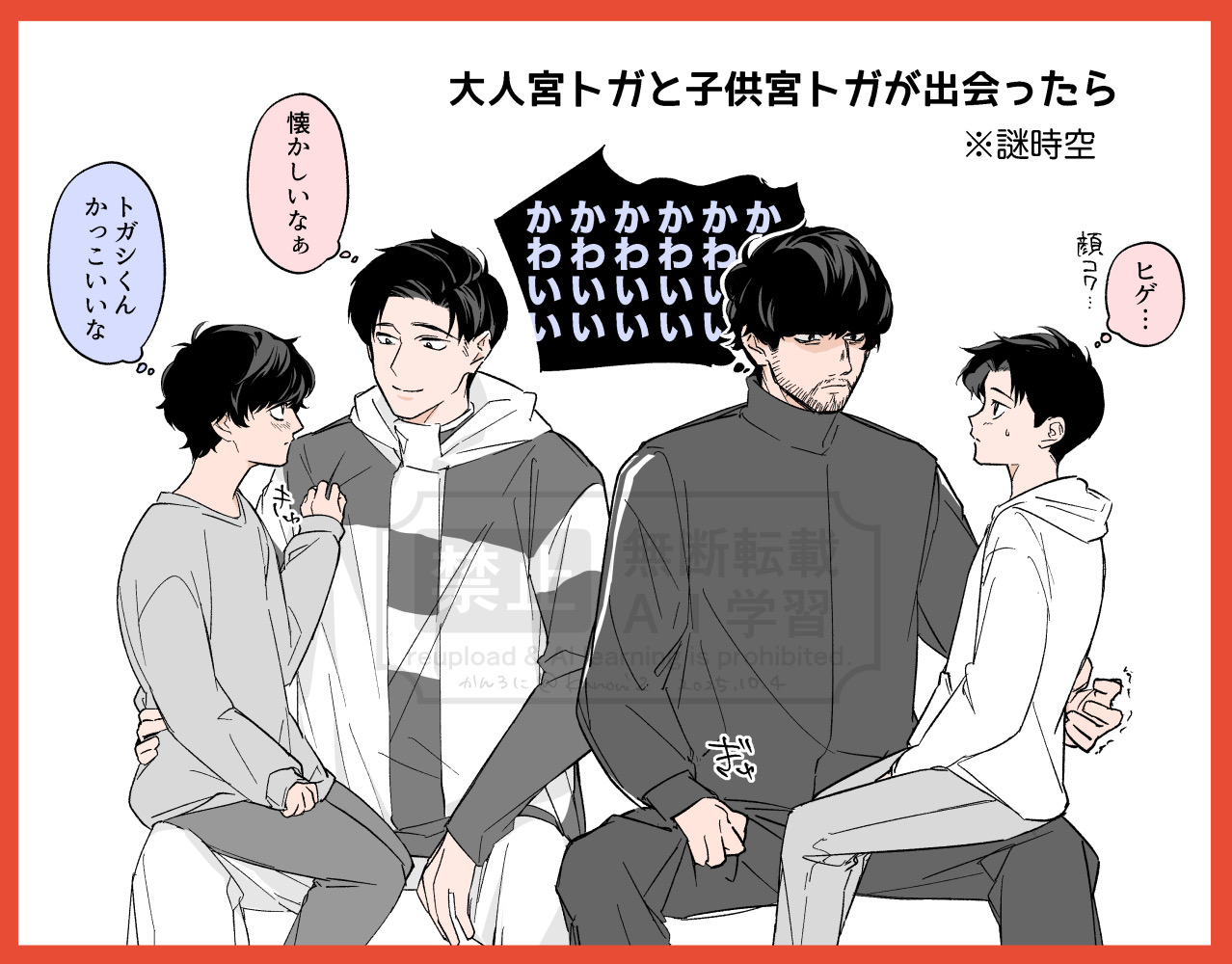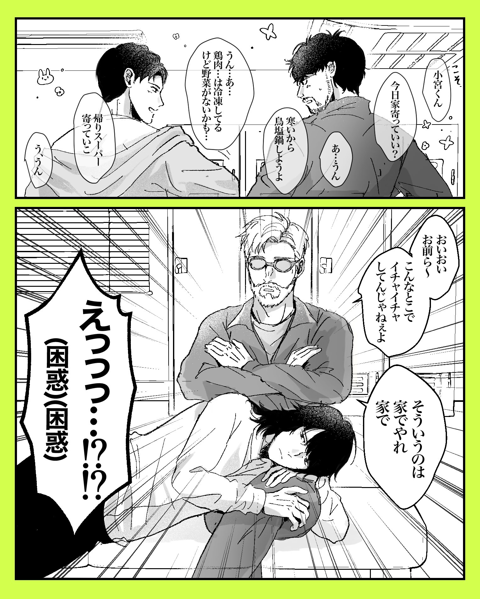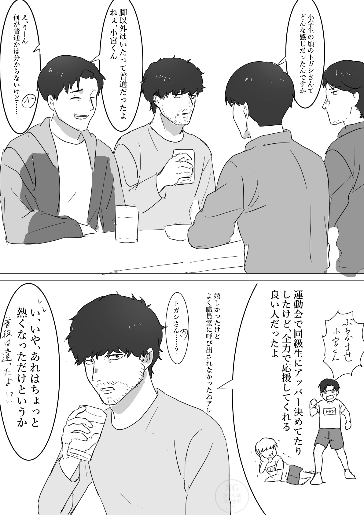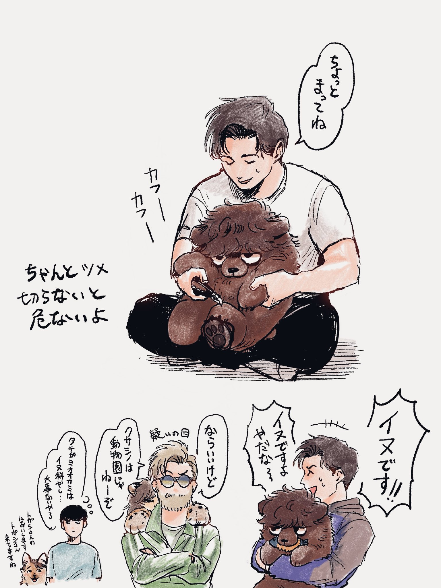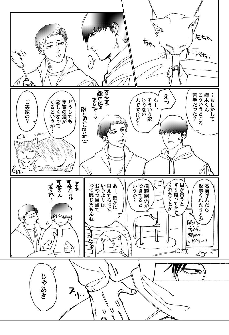 「ふーん?」トガシ揚起眉頭,「小宮くん你有好好回應人家嗎?」「うん。」「真乖。」語畢,他親暱的搓了搓小宮的頭髮。