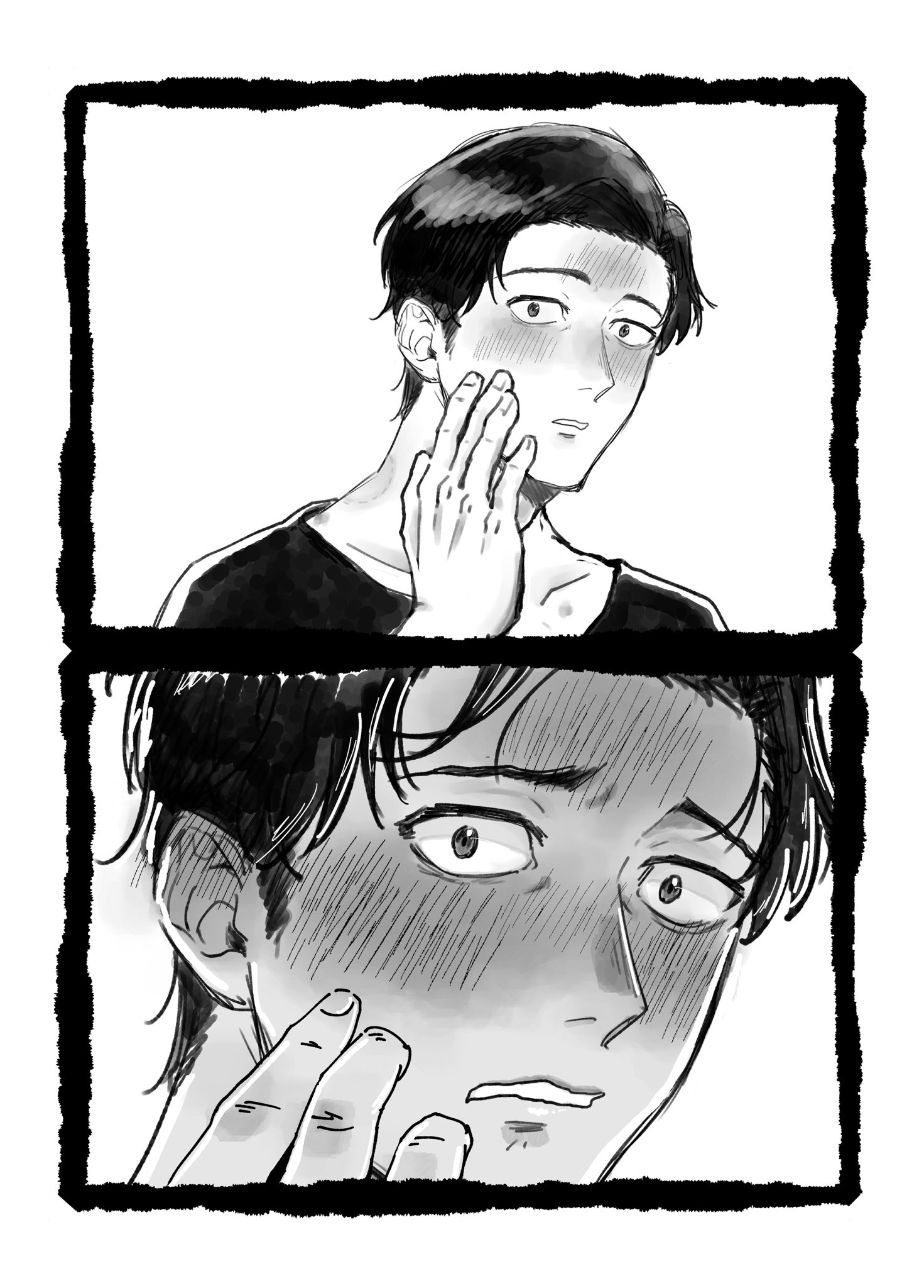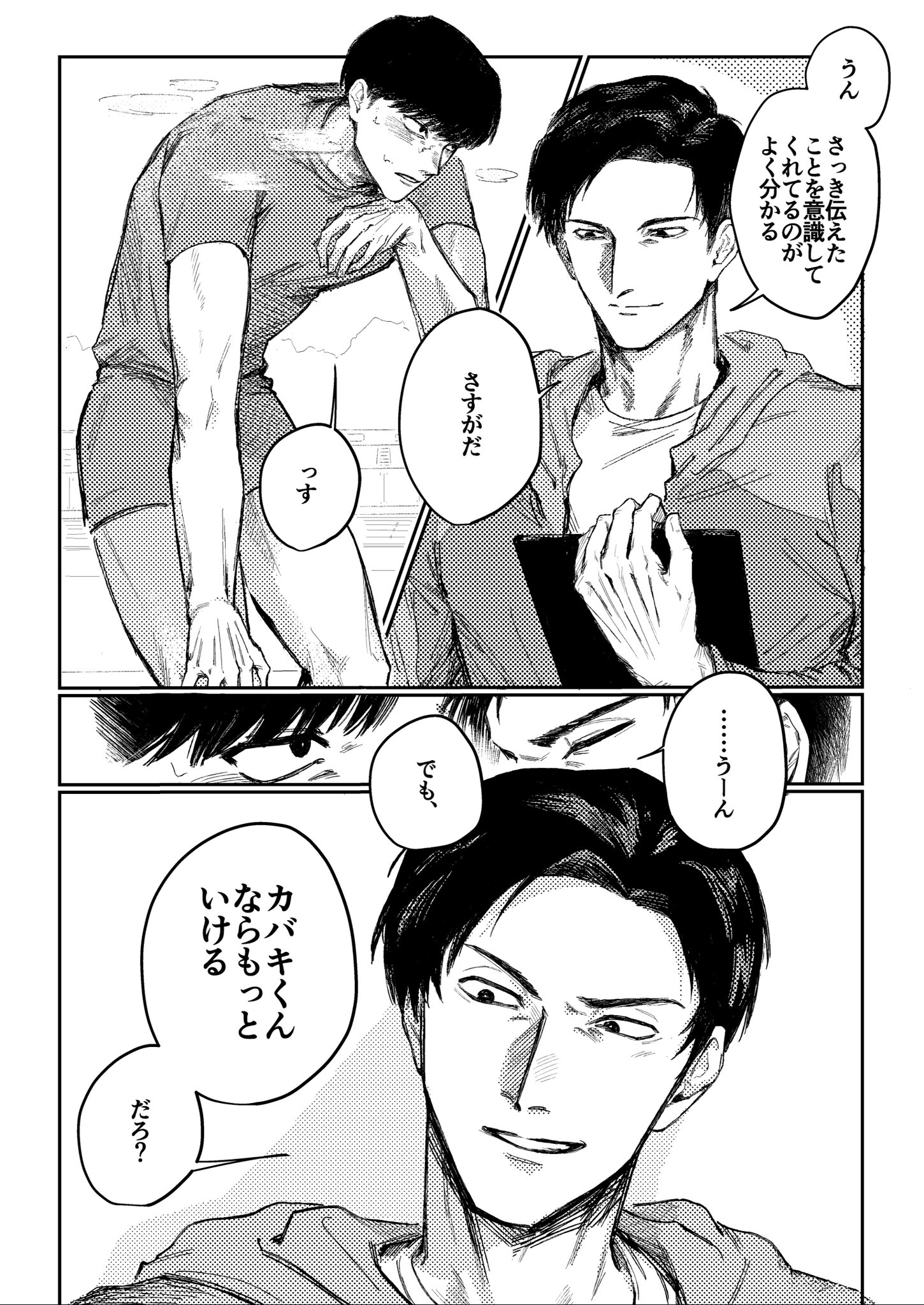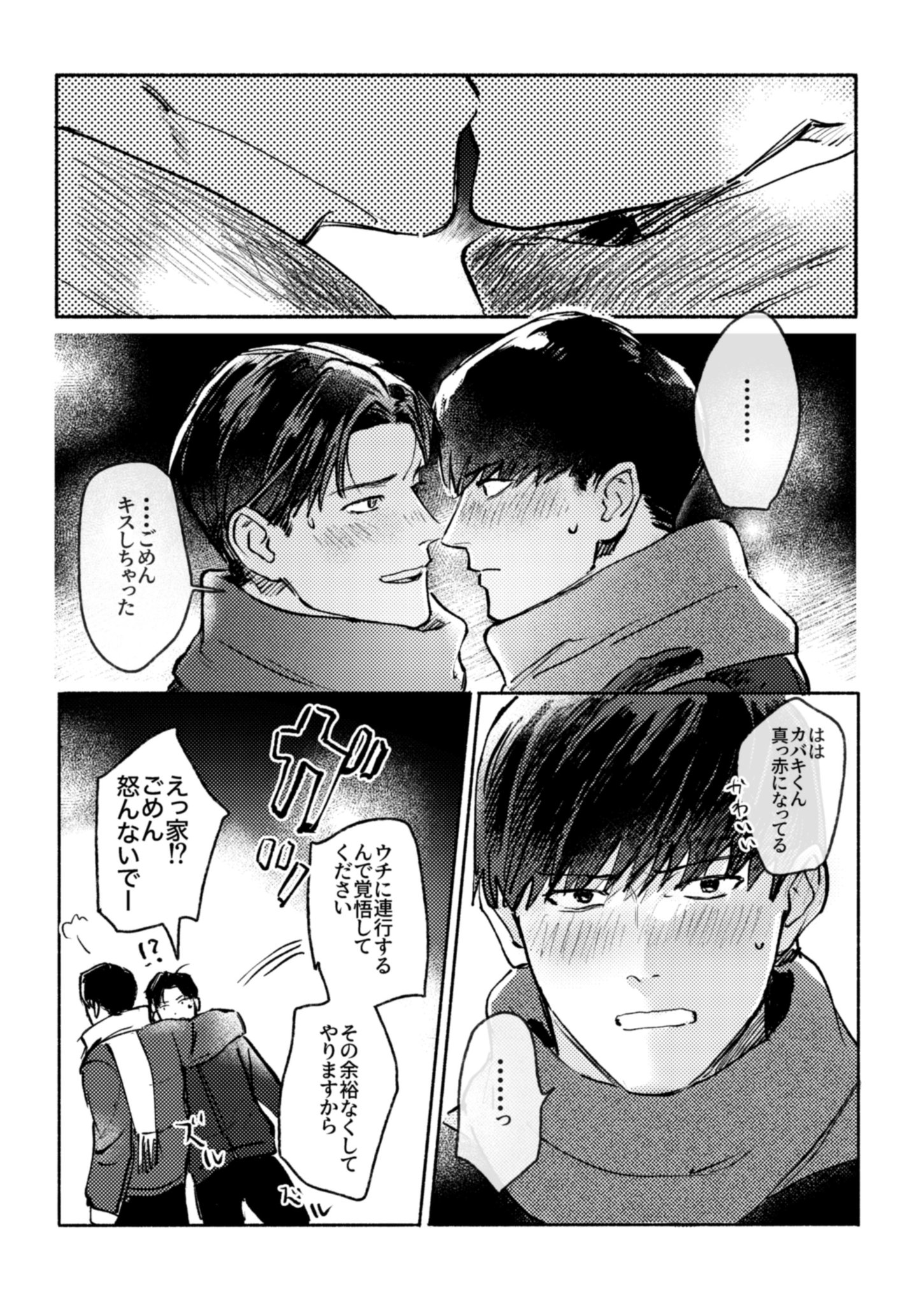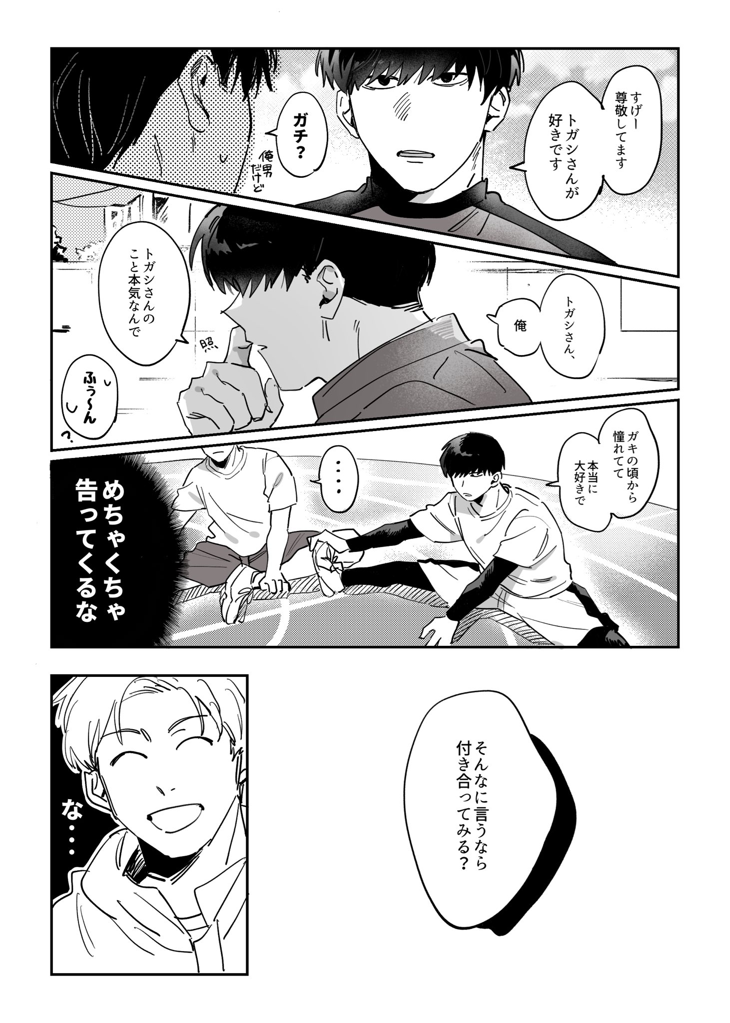 覺得會給對方造成困擾因此推託告白的トガシ,沒想到因為拒絕的不夠徹底反倒讓カバキ找到漏洞可以鑽☺️トガシ在カバキ告白的當下應該多少有一點喜歡他,難說有沒有到戀愛,但至少不會到當機立斷的拒絕。這份猶豫跟天生的溫柔導致他往往會給出模稜兩可的回覆,不打算輕易放棄的カバキ也順利循著他沒說死的話中找到破綻,進而將對話引導回自己的步調上,讓トガシ無路可退。哈啊......カバトガ的告白真是太好看了🥹