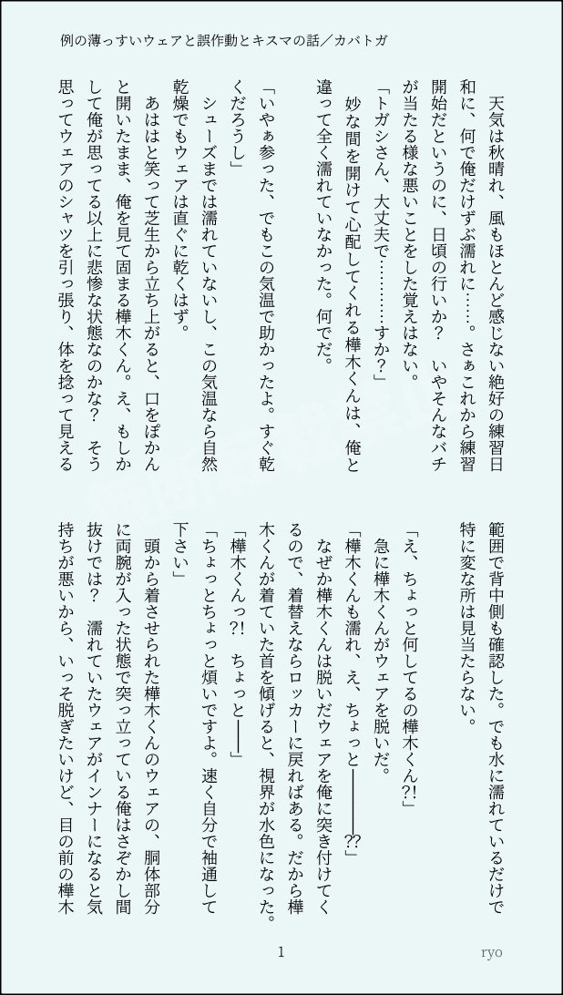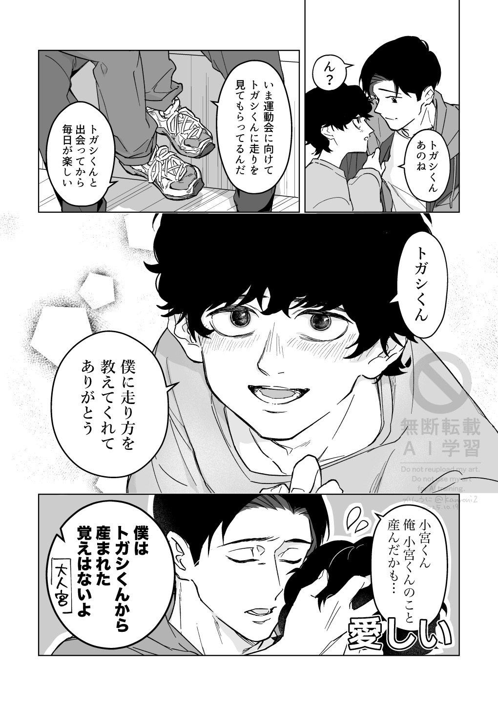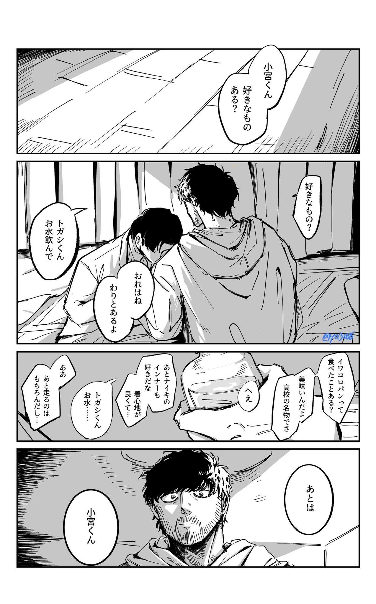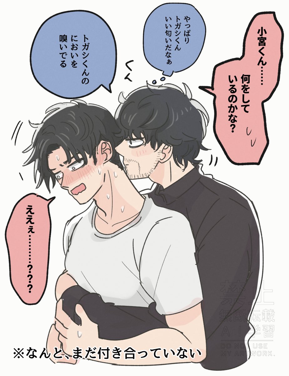 以トガシ的個性來說也許會在交往一陣子後跟小宮坦白,他原先還半害羞半歉疚的覺得自己是在利用小宮的單純,哪知道小宮根本就不介意,他只想掌握トガシ的所有敏感帶跟喜好,反正トガシ每次都知道他需要什麼。トガシ不只是小宮的跑步啟蒙,是人生導師還是最契合的床上教練🥰