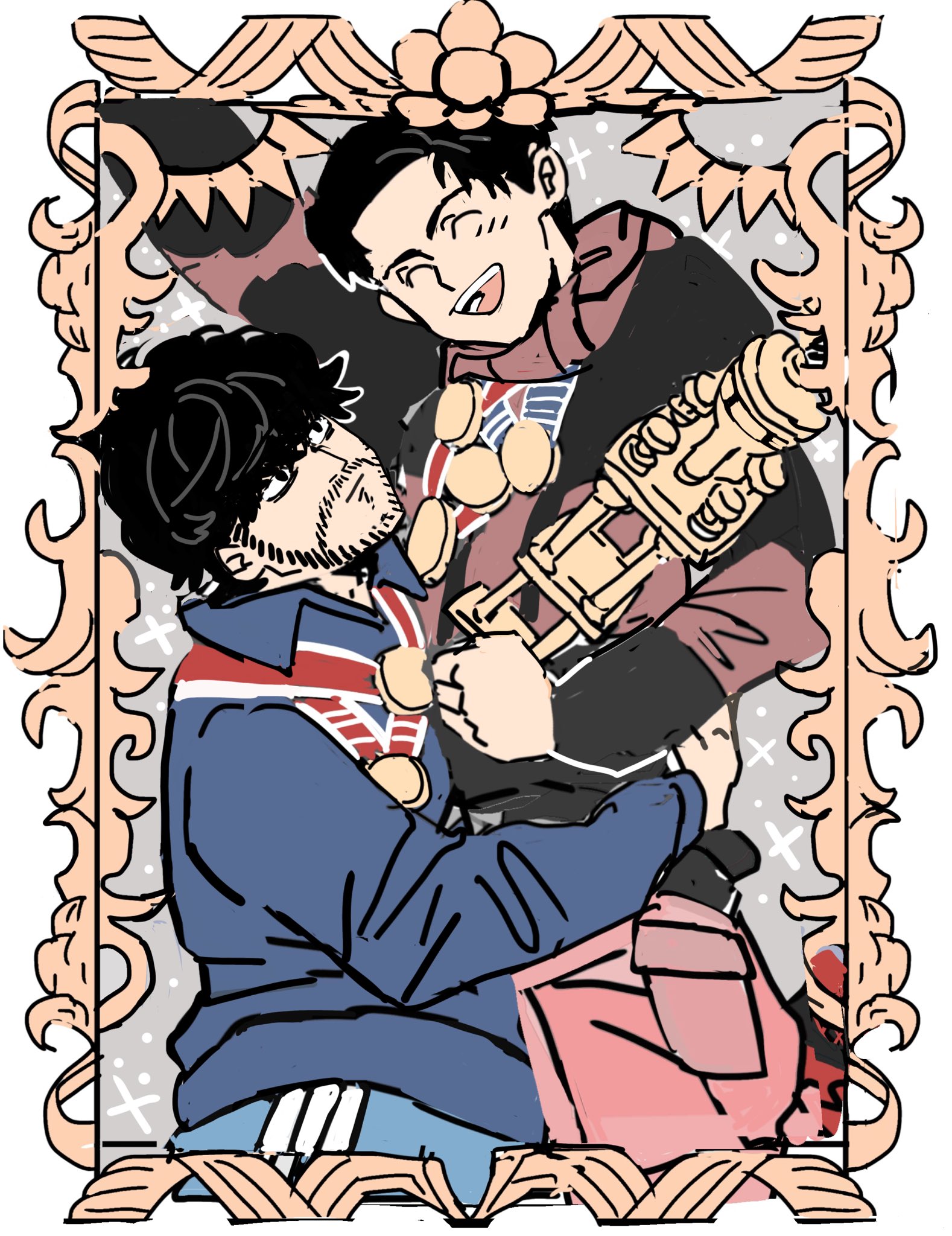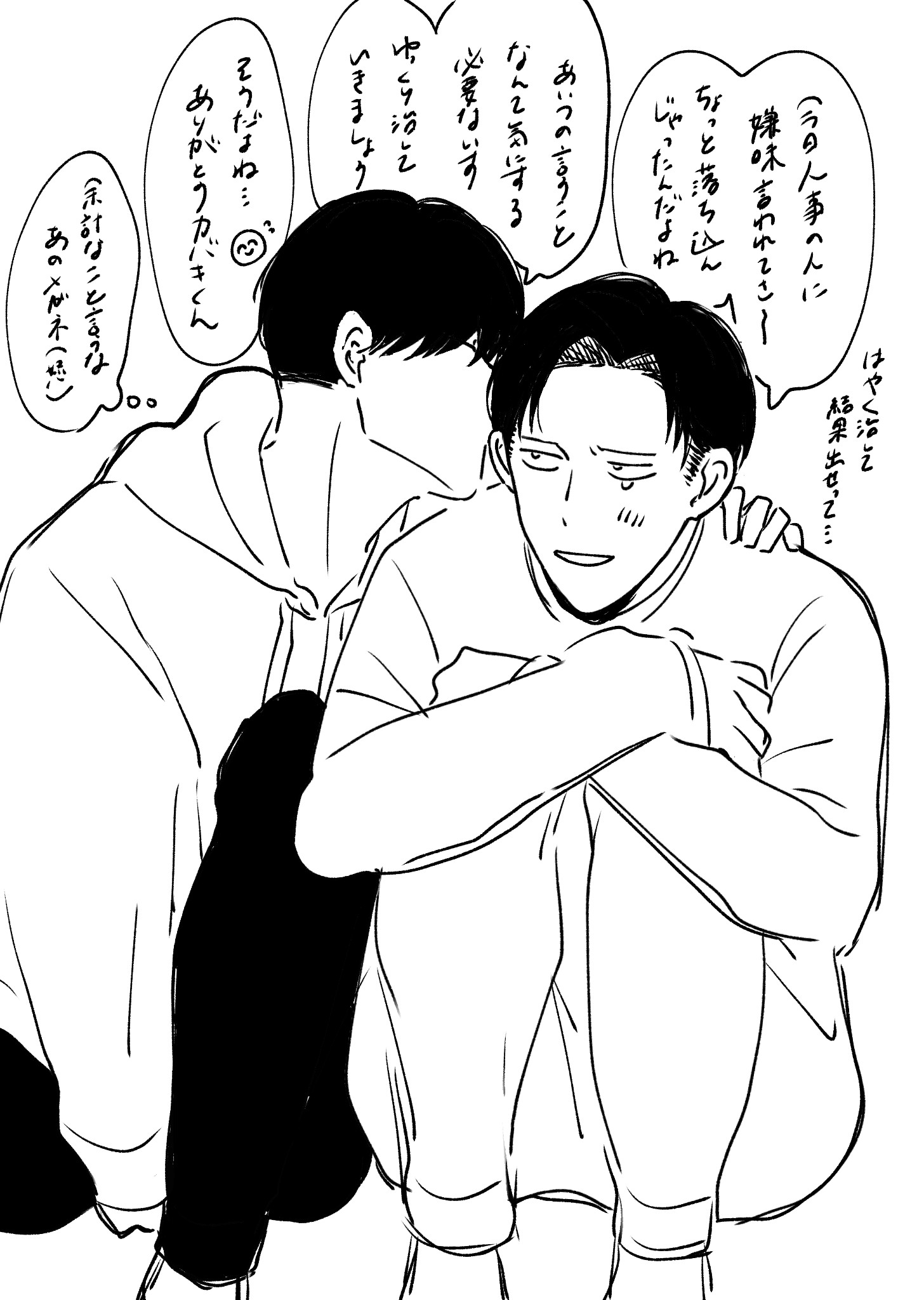 我喜歡看抱抱,我家的トガシ會在陷入低潮時一言不發的把臉埋進小宮懷裡。最初小宮還僵了一下,完全不曉得發生什麼事了,聽トガシ解釋後才慢慢伸手環住他。トガシ解決私人問題的方式是自我對話,願意什麼都不問就這麼安靜陪著他的小宮正巧合適。