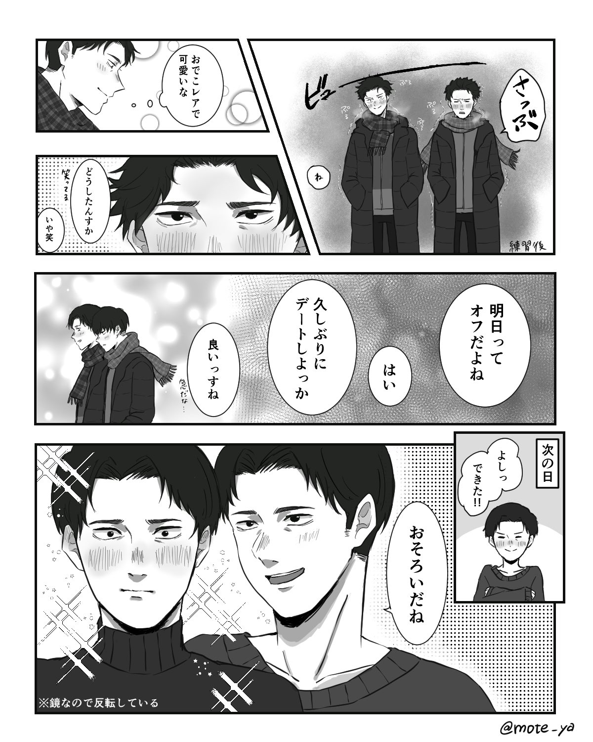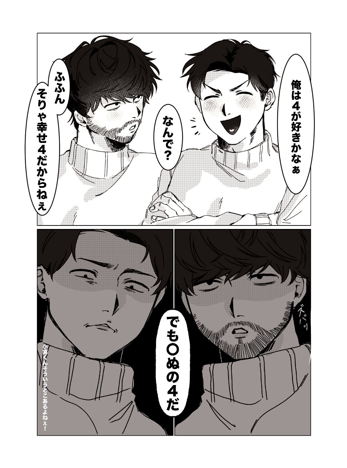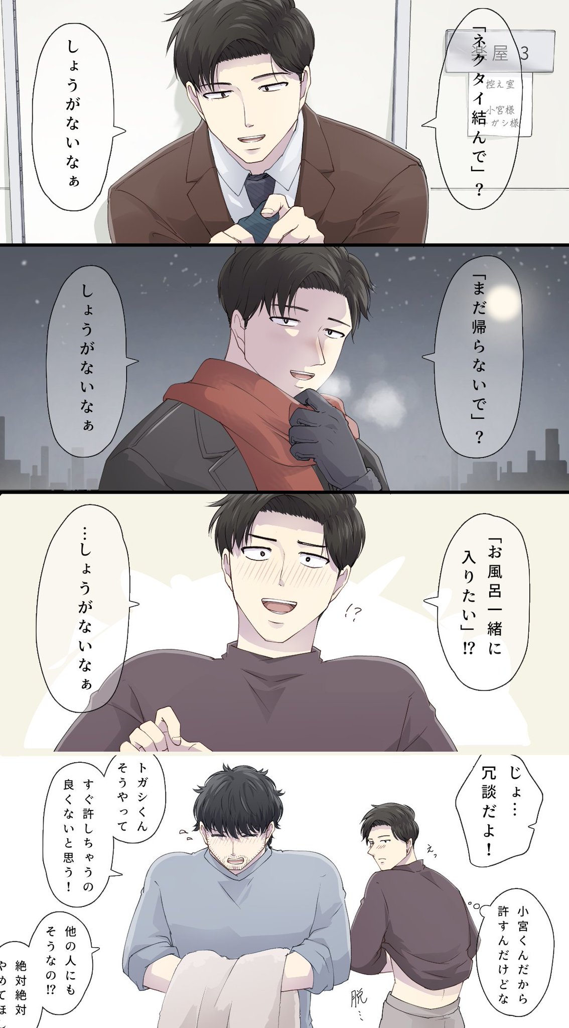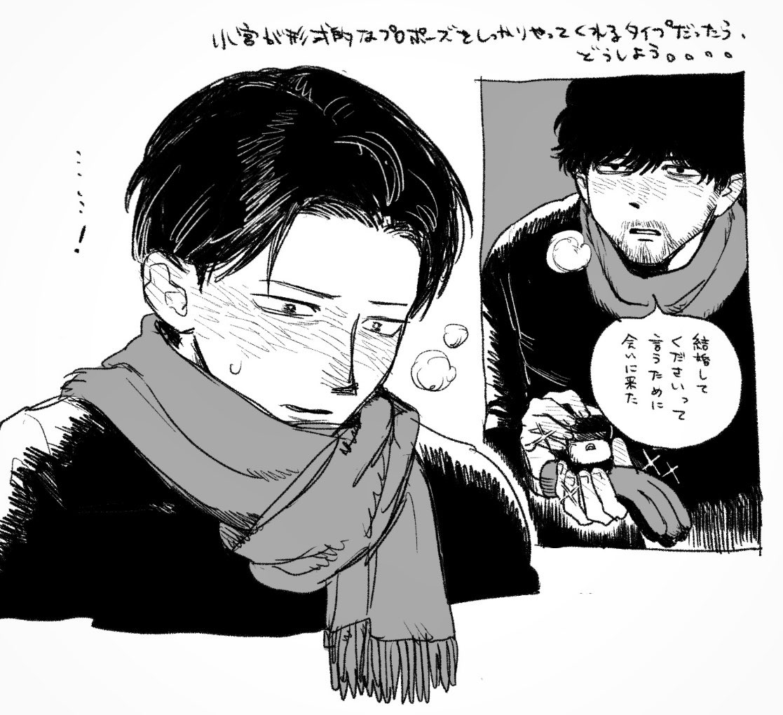 最後剩下トガシ的禮物,他尷尬的笑了兩聲把禮物交到小宮手上:「沒想到最後會變成這樣,不過那天是分開結帳的,小宮くん應該沒有看到我買什麼......?」隨著包裝紙被拆開,熟悉的logo進入眾人的視野。小宮拿出禮物,柔軟的布料蹭的他手心發癢。「這個很保暖喔。」トガシ說著拉開了衣領,「跟我的是同一個款式。」