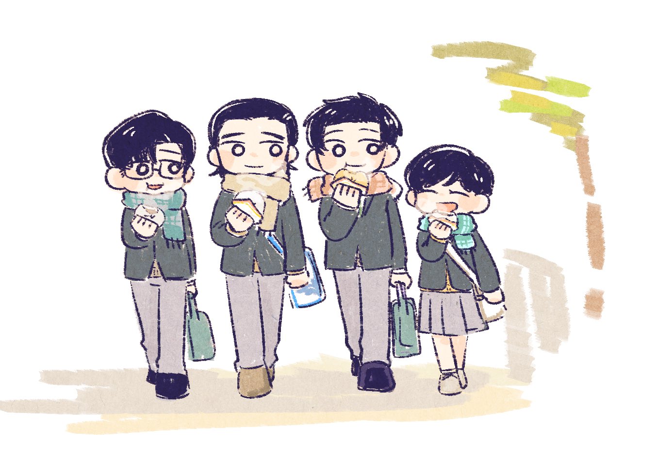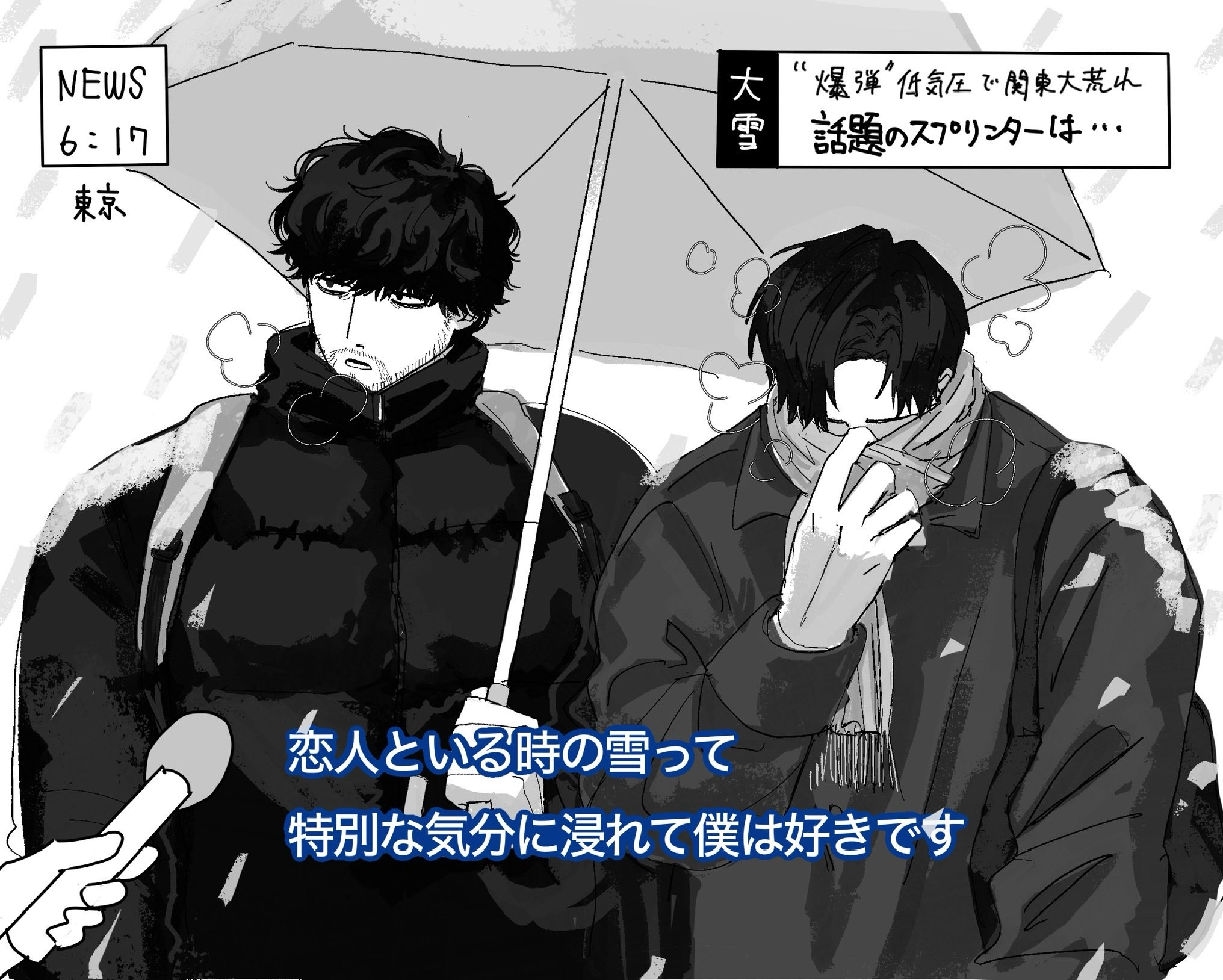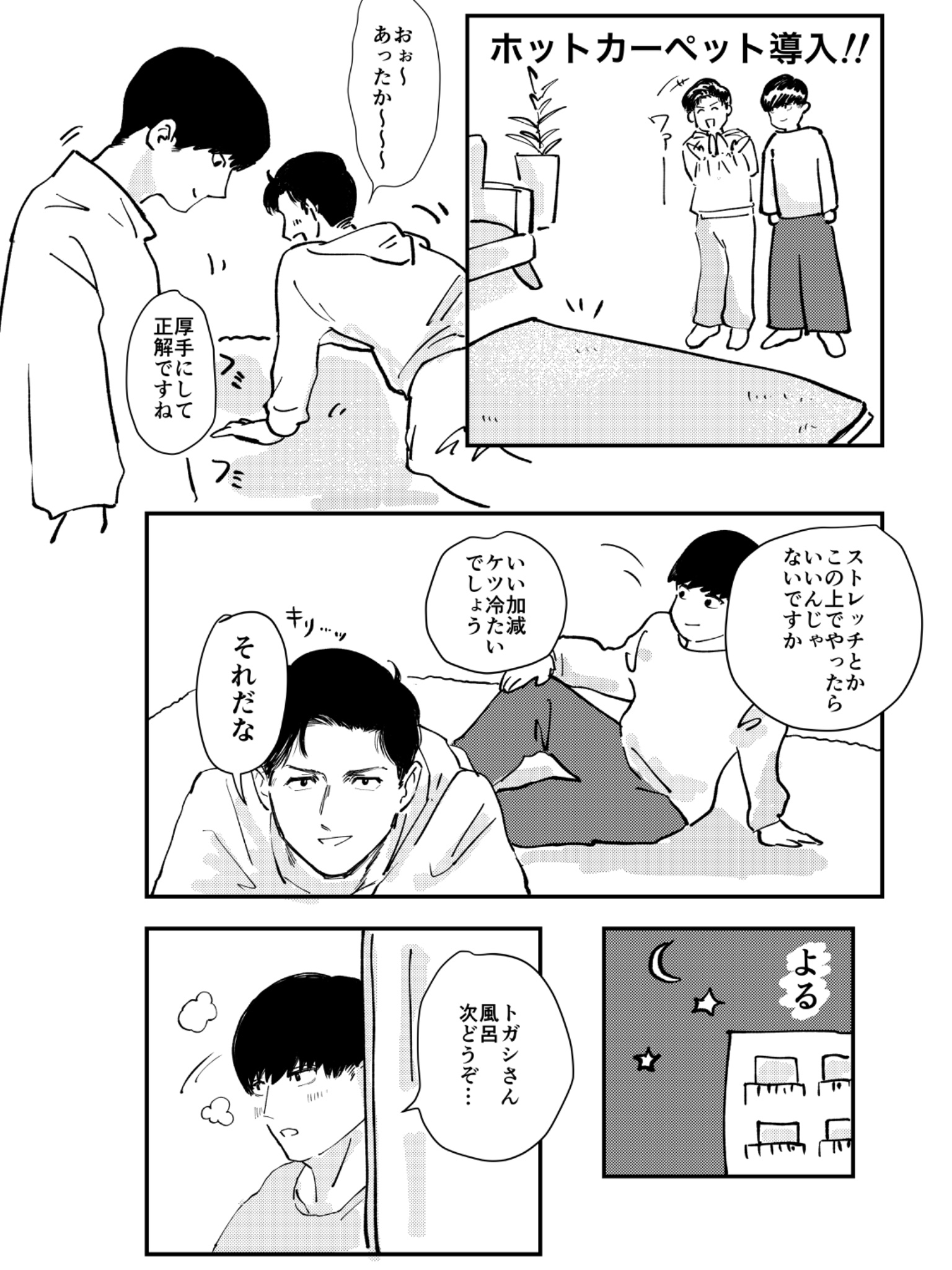 最後剩下トガシ的禮物,他尷尬的笑了兩聲把禮物交到小宮手上:「沒想到最後會變成這樣,不過那天是分開結帳的,小宮くん應該沒有看到我買什麼......?」隨著包裝紙被拆開,熟悉的logo進入眾人的視野。小宮拿出禮物,柔軟的布料蹭的他手心發癢。「這個很保暖喔。」トガシ說著拉開了衣領,「跟我的是同一個款式。」