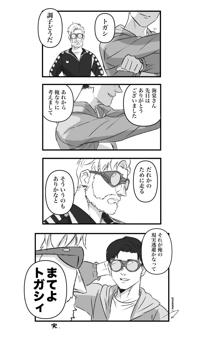 14秒 (@timeof100m)下次人事見到カバキ的時候就覺得他的視線怎麼冷颼颼的,但顧及トガシ的立場所以不會多嘴,反正有他會陪在トガシさん身旁直到順利復歸。