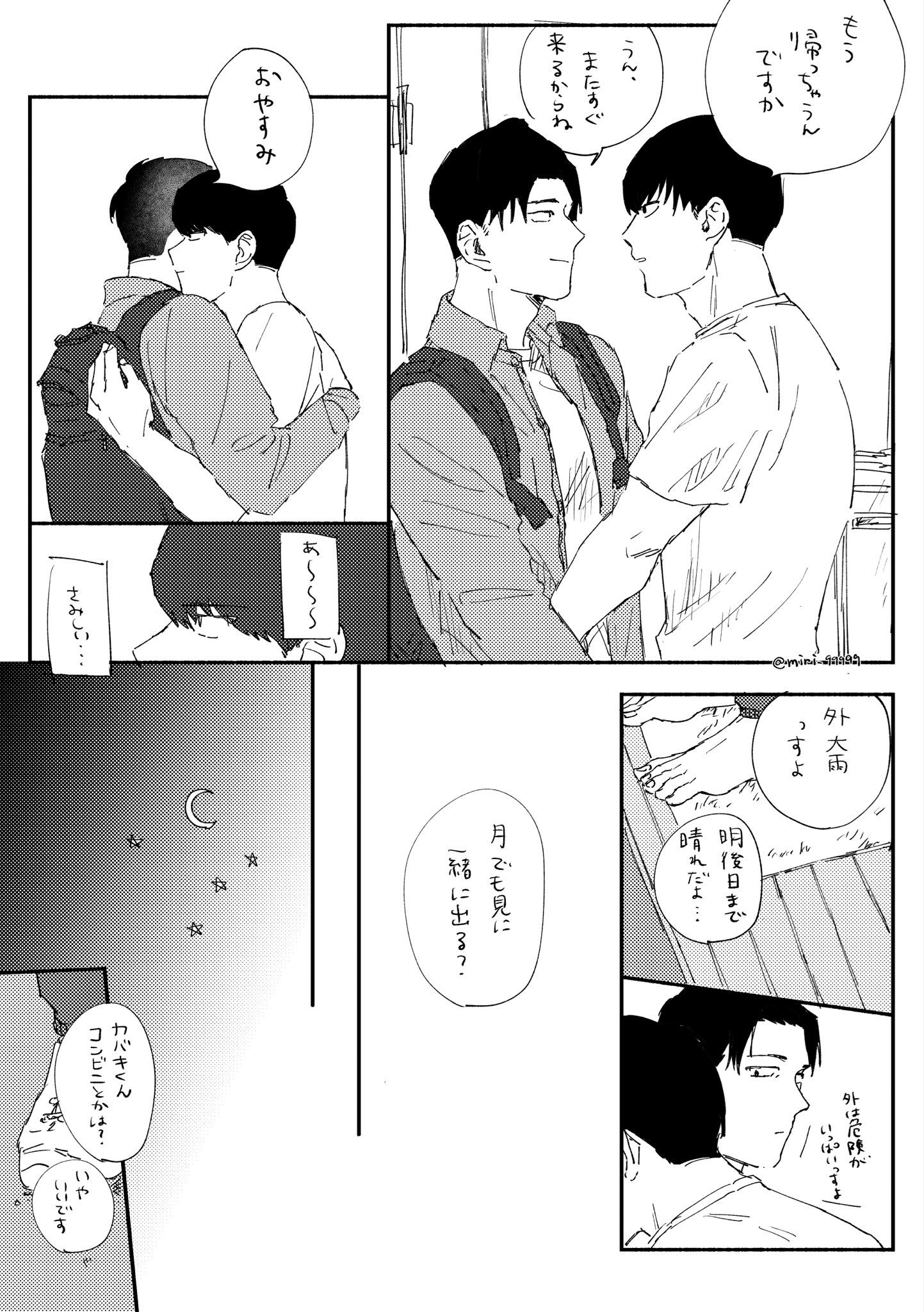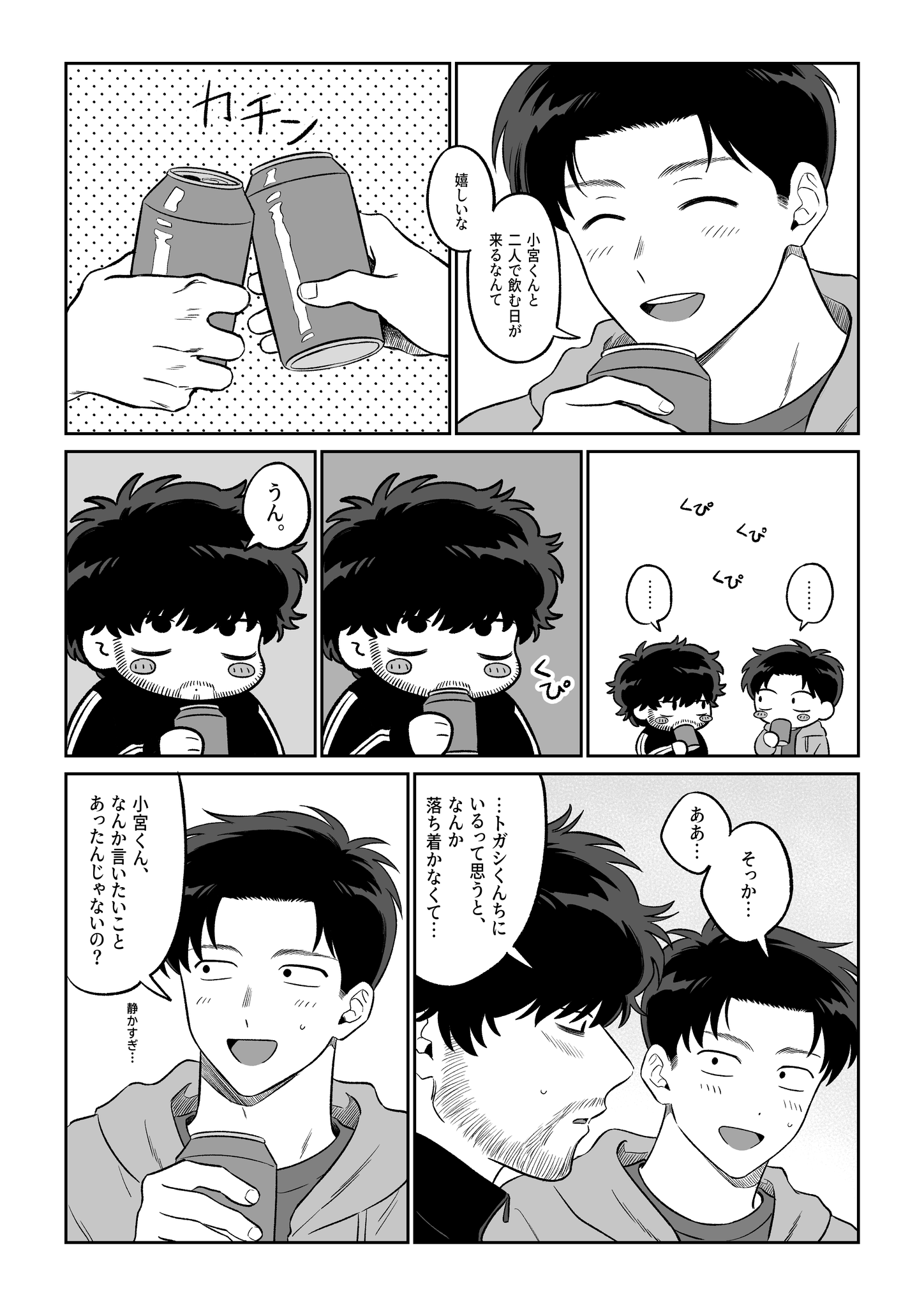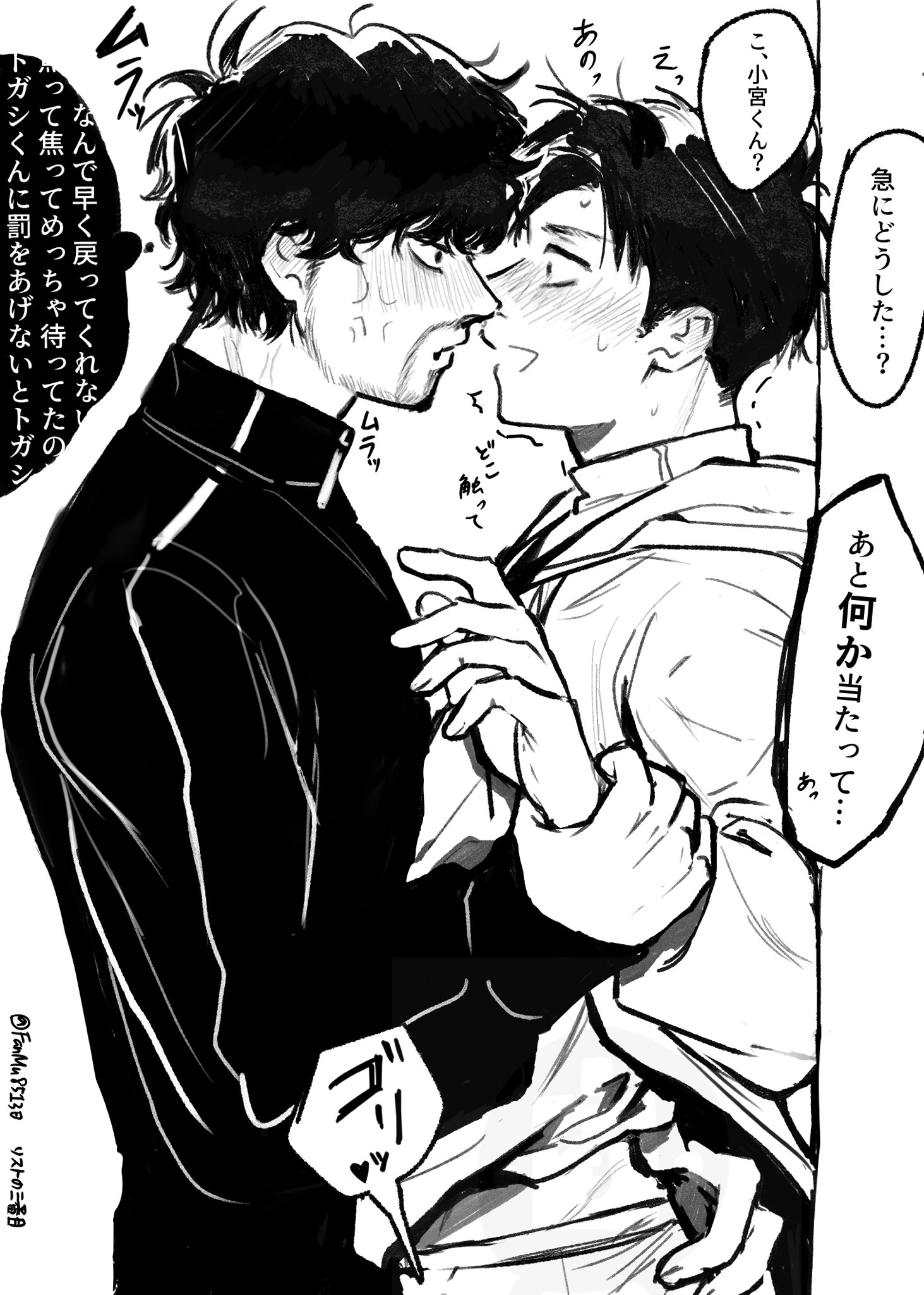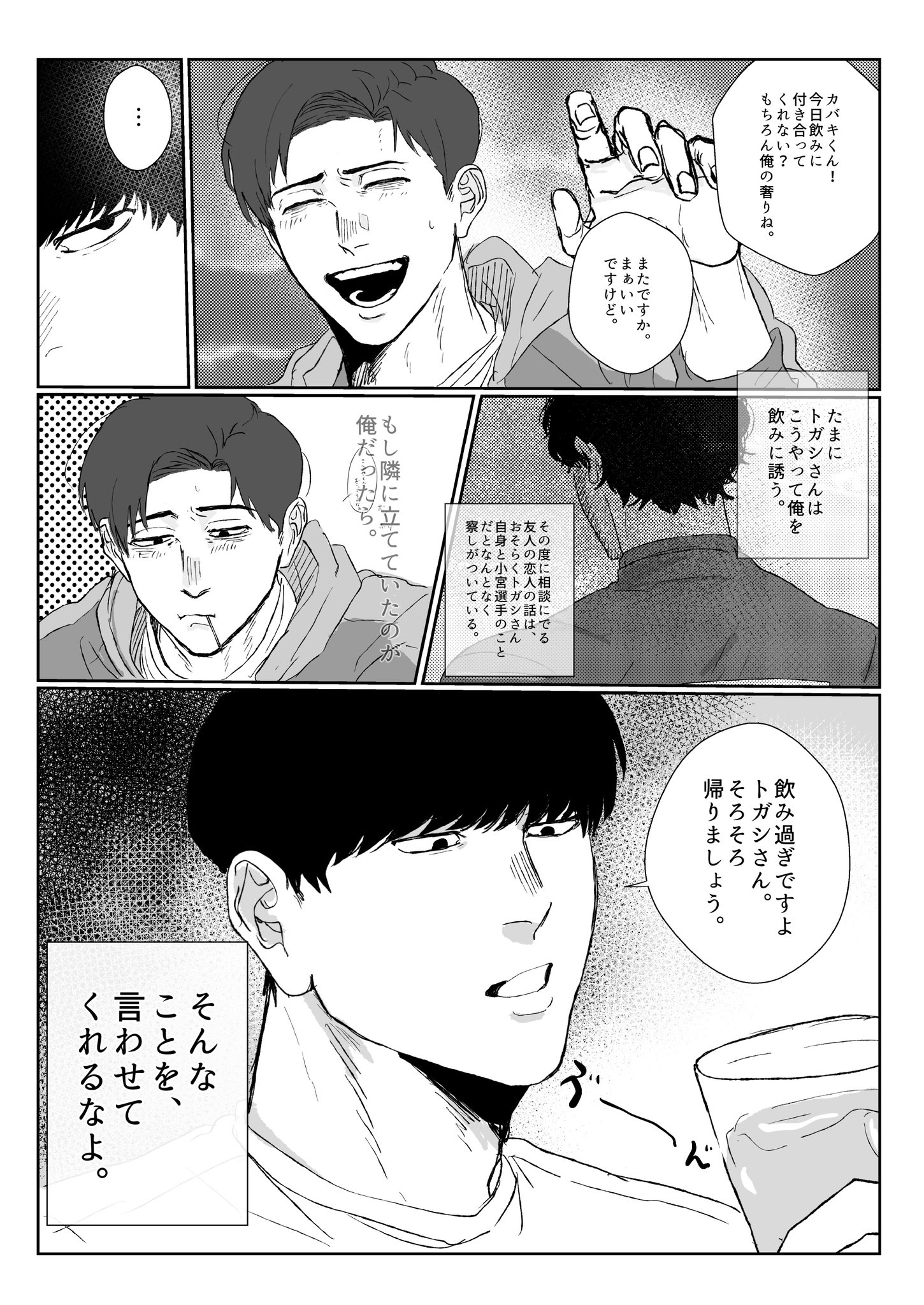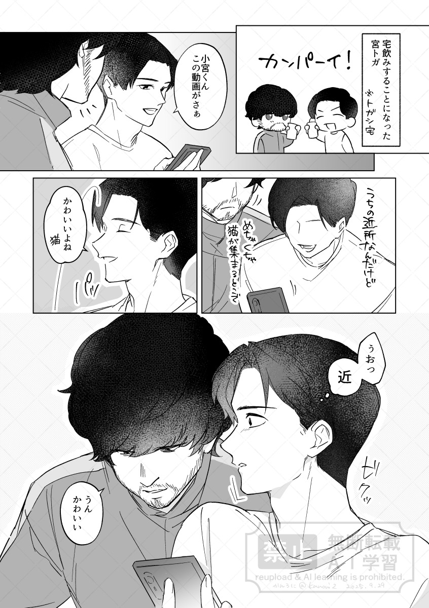 我要死掉我真的要死掉😭😭😭😭原本還很難過小宮丟下自己,結果只是去跟運將說不搭車了。難以想像在看到小宮回來的瞬間,トガシ有多激動又有多想哭;;完全沒打算丟下他的小宮自然也不會想到要跟他說一聲啊;;;親完就逃進夢中獨留不知所措的小宮真的好好看,好喜歡每次トガシ喝醉對他親親抱抱啃啃就會擔心他在外面是不是也這樣的小宮🥺還是建議トガシ不要獨自在外面喝酒了,就算不會對其他人失控也難保其他人不會趁機對他上下其手(好)