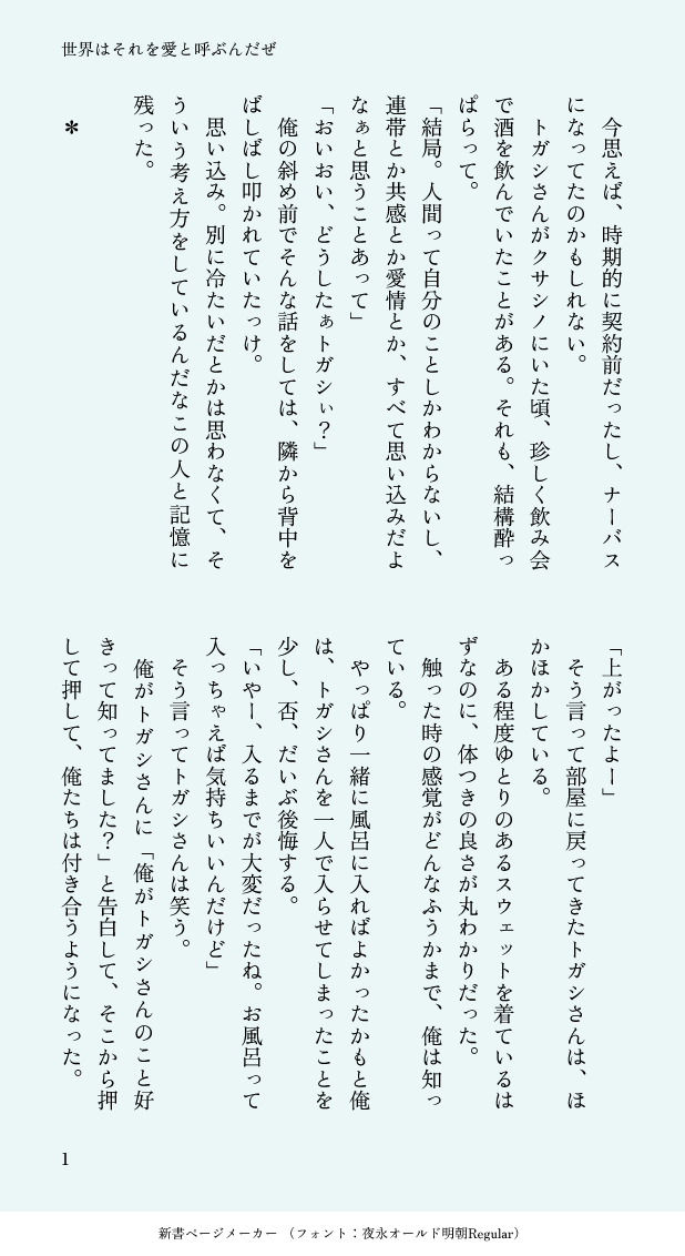 超級好看......很喜歡用貓跟狗撒嬌的方式的來形容トガシ撒嬌的行為有多稀奇還有胸口彷彿降下無數星辰的描述,從說出「人的各種情感全都是單方面的思緒罷了」的トガシ願意以言語表達對他的喜歡甚至向他撒嬌,來說明他喜歡カバキ的程度實在太好看;;對カバキ來說這便是トガシさん確實喜歡著他的證明🥹