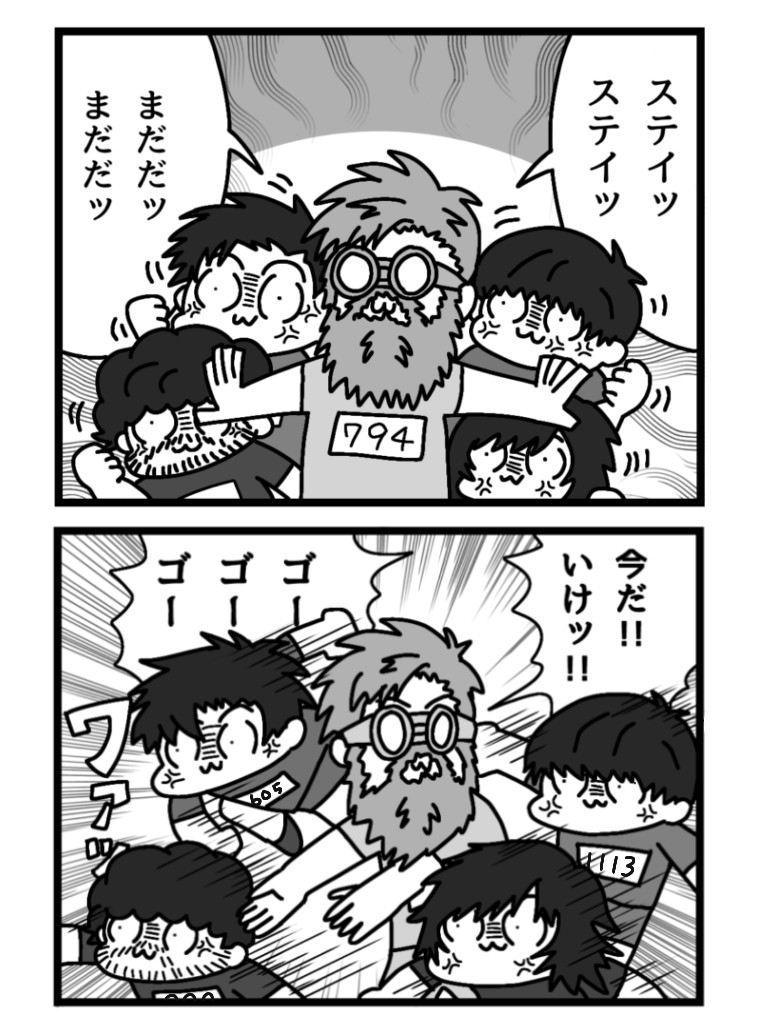 正當大家都以為小宮會送保溫瓶或蛋白飲的時,他送了超有品味的圍巾或手套,大家超級驚訝想說那個小宮竟然送了跑步之外的產品?!結果謎底揭曉,是トガシ帶他一起去挑的。得知小宮打算送蛋白飲的トガシ覺得這樣下去不行,乾脆以出去玩為藉口誘導性的帶小宮挑交換禮物。好喜歡覺得送蛋白飲完全沒問題的小宮,他看トガシ聽完臉色難看還問他身體不舒服嗎?トガシ為了不讓クサシノ的夥伴跟自己抽到蛋白飲私底下做了很多努力啊