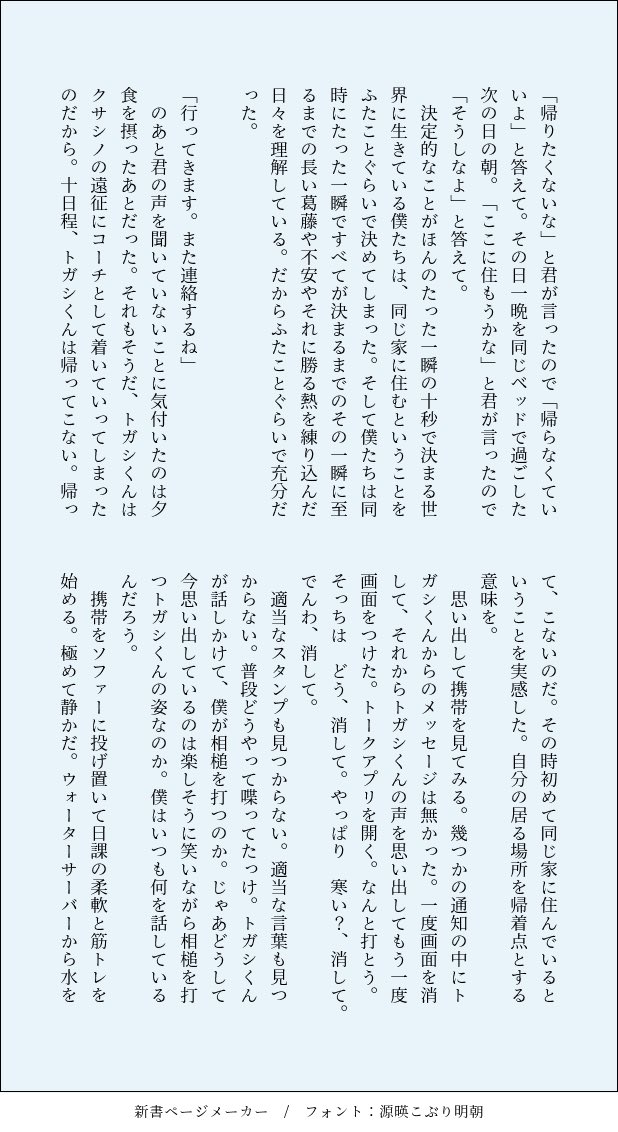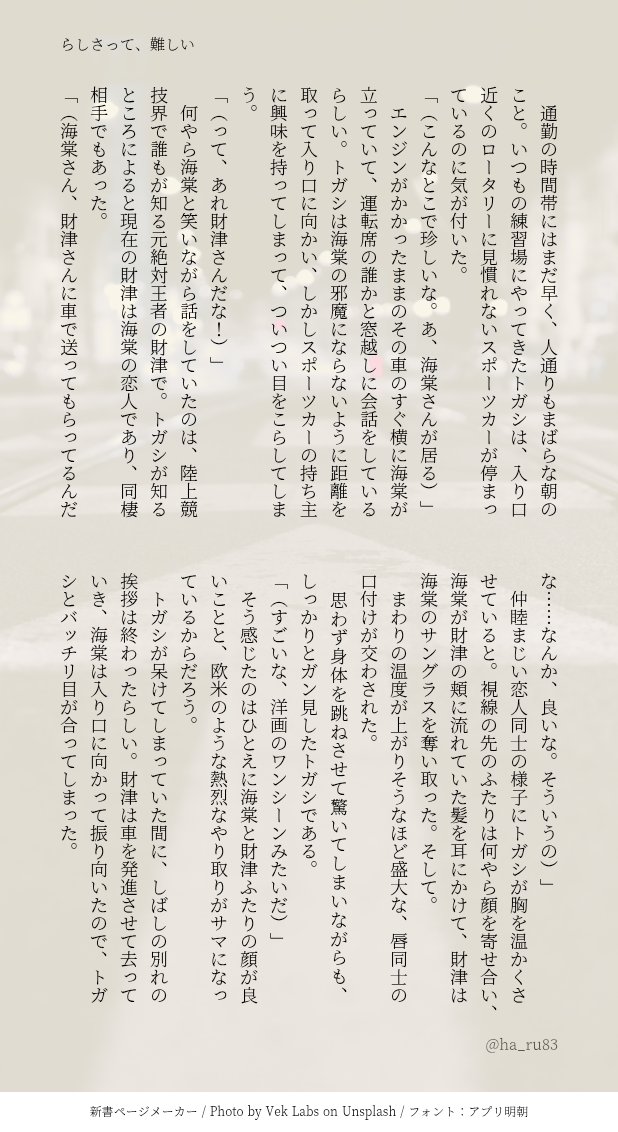 我要哭了,今天用音声ガイド看,發現日本選手權那邊トガシ是從飯店出來的😭社會人的住處說是マンション,雖然可以是自租也可以是社員寮,但如果是社員寮應該會直接說是社員寮吧😭不知道......但同人女不想放棄解僱後臨時借住其他人家的可能性......不過想一想也有想省房租退租回老家的路線,然後就可以發展成皐々太太寫的狀況🥺