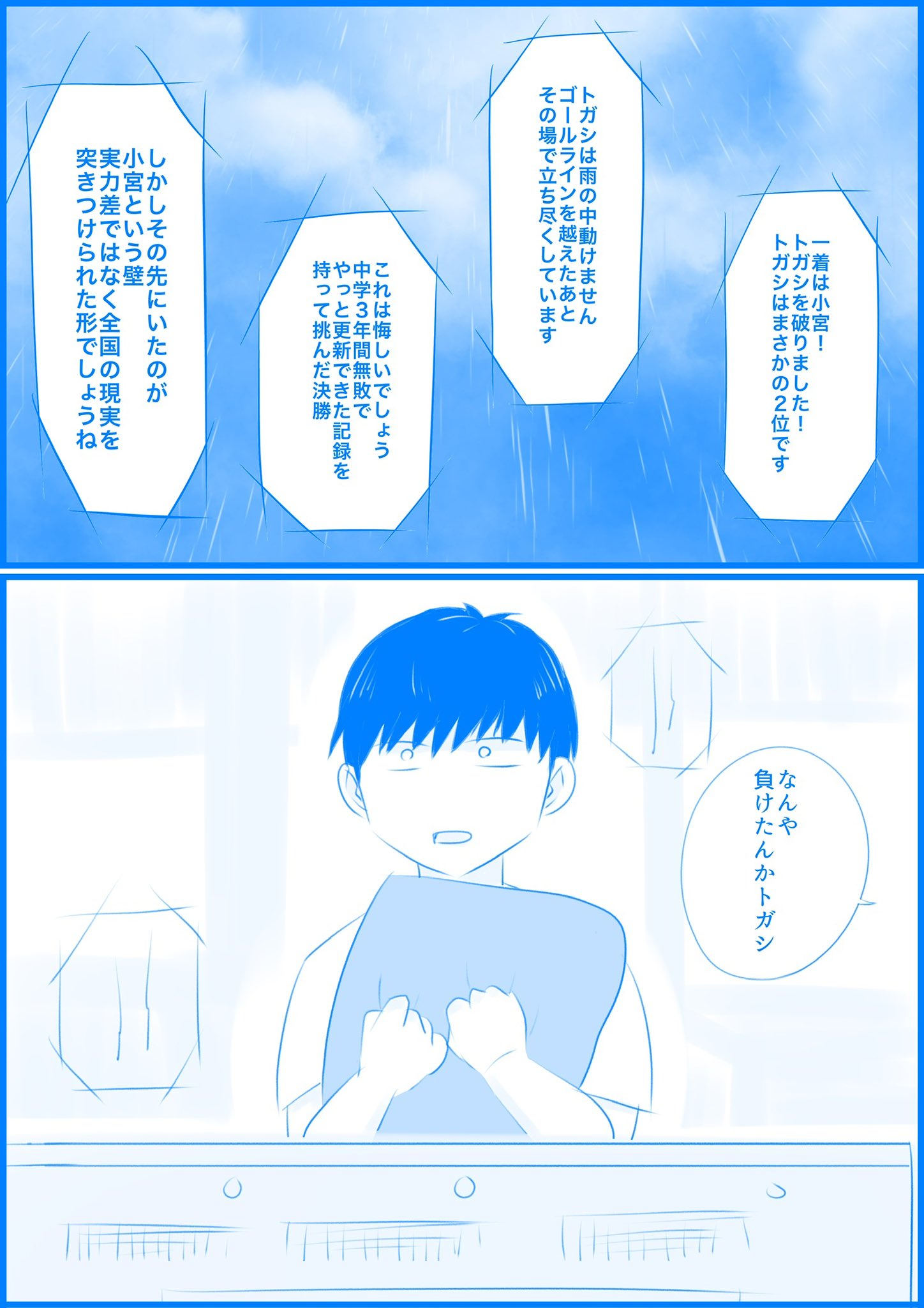 尤其是在小宮面無表情的超越自己時,トガシ好不容易積累起的自信一瞬間就崩塌了。盡全力跑的他很快,盡全力跑的他應該比任何人都要快才對,明明應該是這樣,現實卻無情的搧了他耳光。(此段可參考原作決賽小宮的心境,在意識到可能會輸就失速)