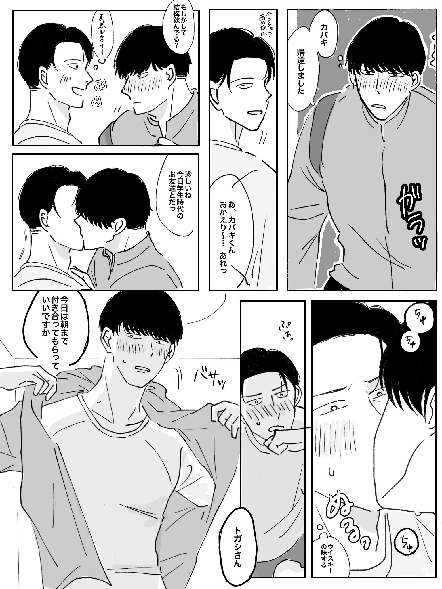 兩人獨處距離感就突然變成0的カバトガ超好看,在外面忍多久回家就貼的越近,原本以為保持距離關係就不會被發現,結果兩個人的態度超級明顯,海棠甚至會對說カバキ說不想暴露的話得先想辦法收斂你的視線。トガシ在沒交往之前只覺得カバキ好像時不時會盯著自己,交往之後才體會到他的視線有多麼火燙。不過也只有他們周遭的人感覺得出來而已。