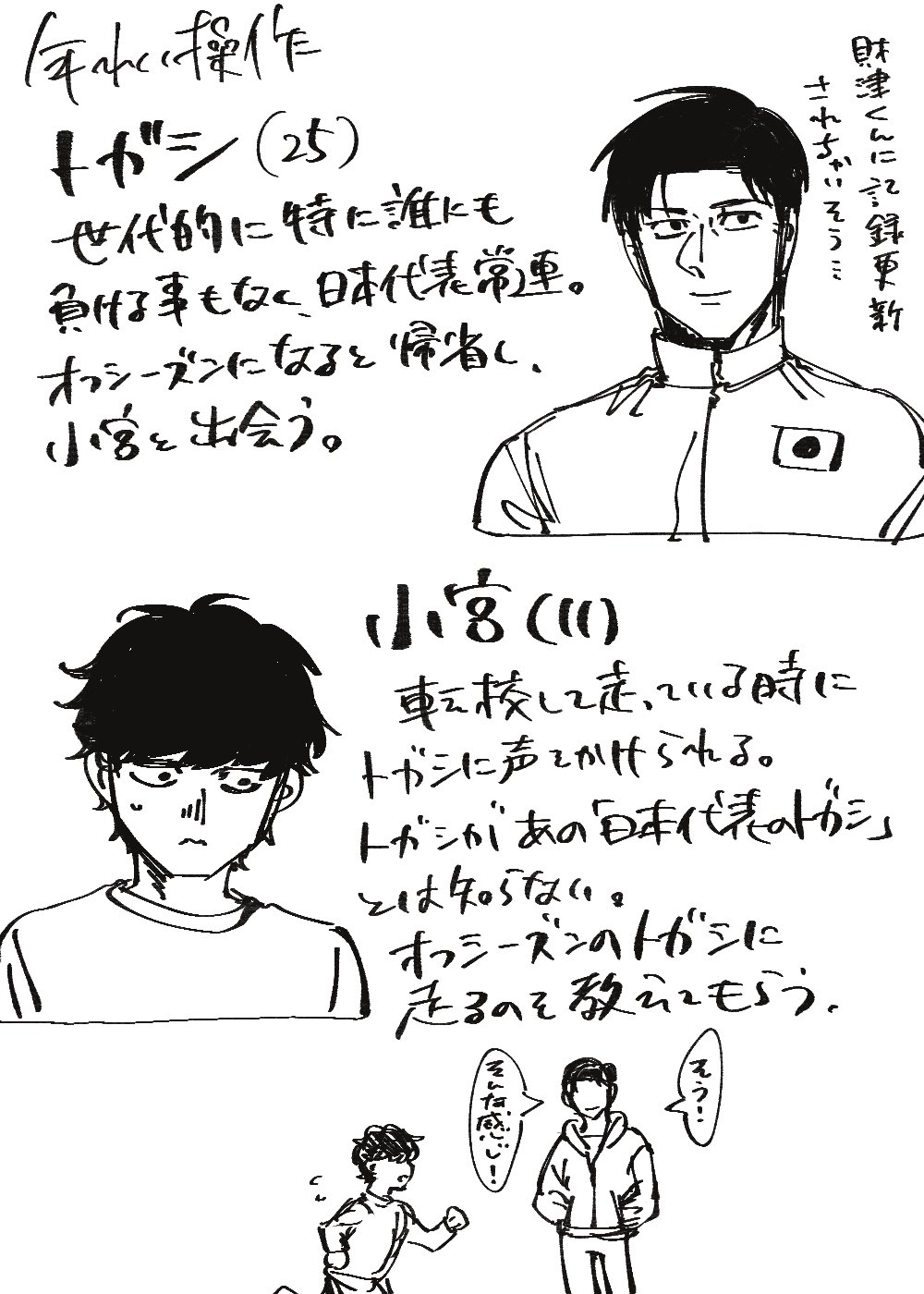 我也覺得トガシ不會把他人對自己的好感往那方面去解讀,甚至有可能完全沒察覺到。他對情緒很敏銳,但同時認為自己除了跑步之外沒有其他價值,大家喜歡的是跑道上的自己,除此之外的部分就不怎麼關心。