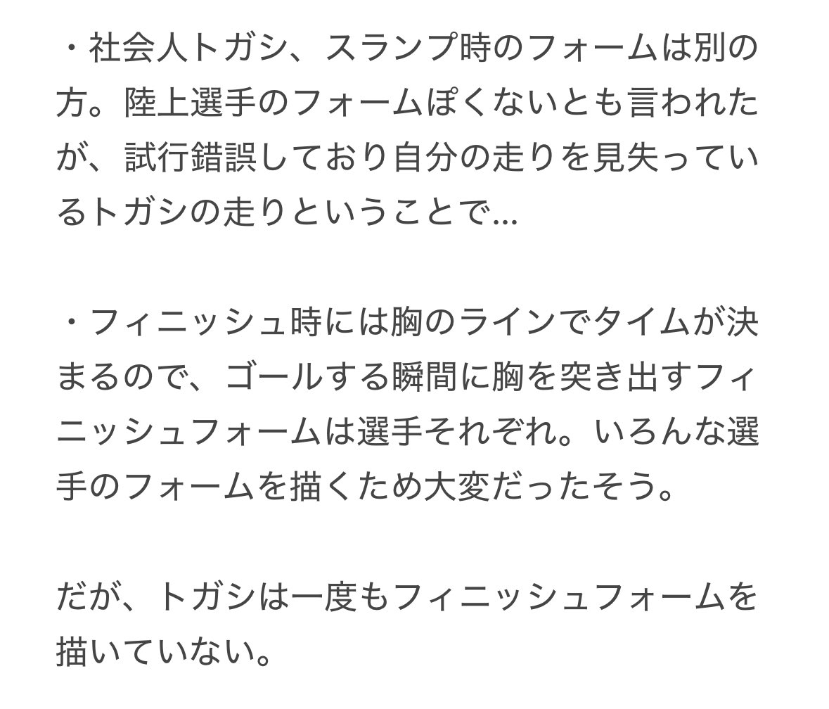 之前看過別位太太說,トガシ的心態在中學後就從領先者轉為被追逐者。落敗的恐懼讓他無法只專注於終點線,而根據ティーチング的回答內容來看,正是因為被恐懼佔據心頭,トガシ的跑姿才會逐漸變形。