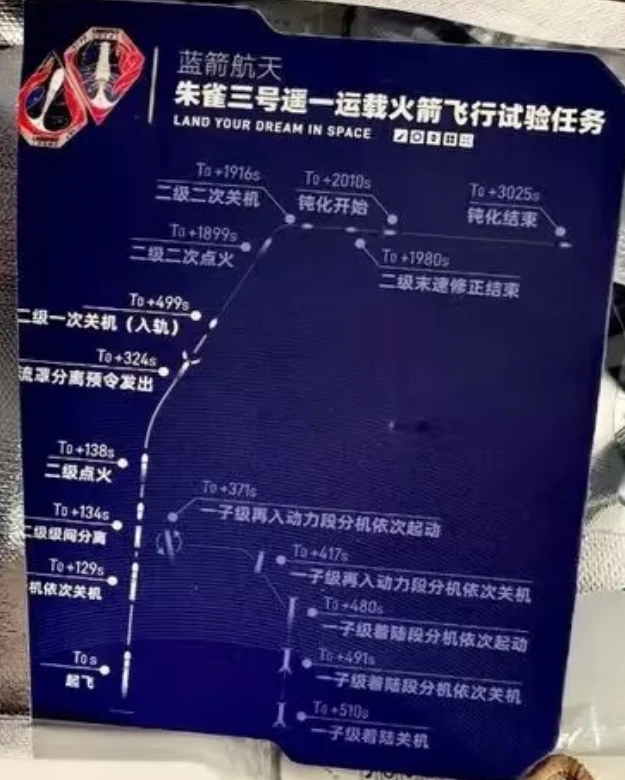 朱雀三號第二級成功插入軌道,第一級回收嘗試失敗,但是非常接近,在最後的階段可能引擎點火出問題