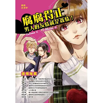 老實說,看BL作品的時候,我大概都是以一種好奇、旁觀的心態在閱讀,也不太會有帶入哪個腳色的狀況(不管是攻或受)。或許就是這樣,之前看朋友在聊腐話題的時候,就會有種自己似乎漏了什麼的感覺。看了腐腐得正之後,有比較解惑一點(?)吧