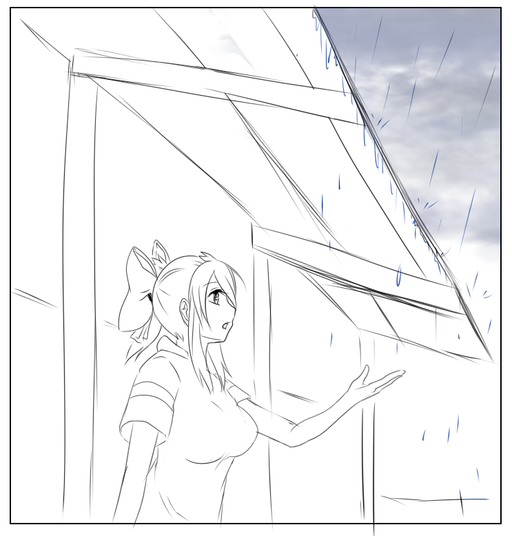 仰望著那烏雲密布的天空,暫時只能躲在店家外頭的屋簷之下了。