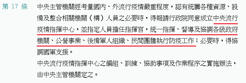 關魚 on Twitter 防疫視同作戰,即使有地方制度法讓台北維持地方自治,但依照《傳染病防治法》第17條第2項授權成立的中央指揮中心,本來就擁有最高指揮權,台北市不聽中央指揮亂搞一個月的危害越來越明顯,只要民意支持指揮中心接管北市的聲浪夠大,柯文哲再不甘願也得交權