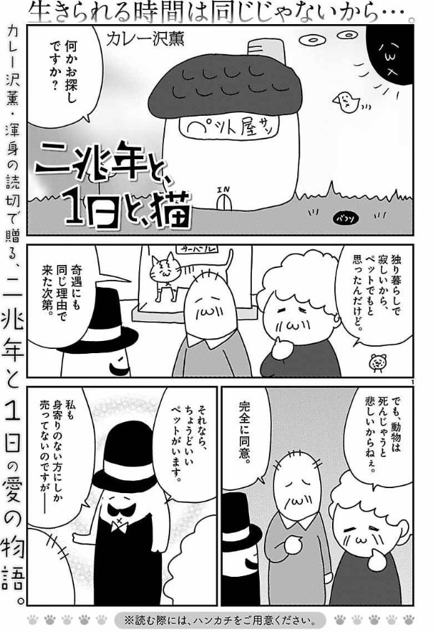 記得以前有看過一個有關兩只很長命(好像是100萬年以上?)的貓的漫畫, 但忘記叫什麼了, 也記憶模糊…他們走過很多個星球, 其中一只知道自己會比另一只先死但沒有告訴另一只, 先死的那一只向往和人類的關係但另一只不信任人類