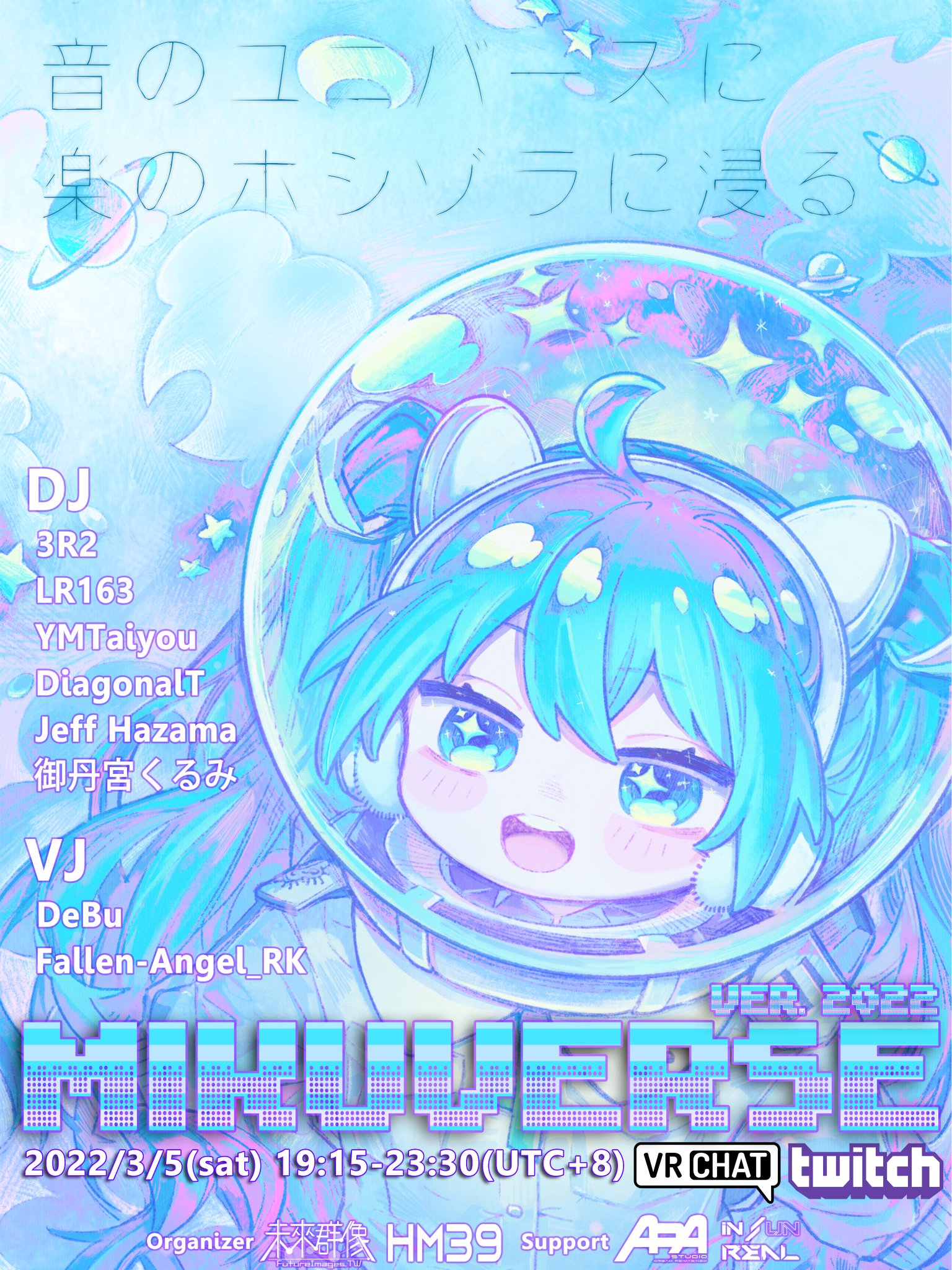 初音未來即將邁向15周年,這次「未來群像」與「HM39 」 一同合作舉辦了線上VocaClub活動,「MikuVeRse ver. 2022」,將於3/5 19:15~23:30(UTC+