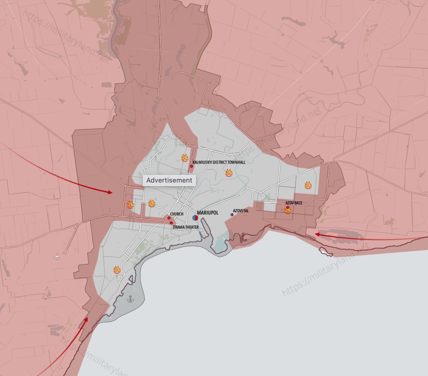 Ukraine War Map on Twitter南方戰線,俄軍在科松市外圍遭受烏軍擠壓,雙方戰火進行中,先前傳出俄軍可能會登陸敖德薩,看來也不可能執行了,因為所有跡象顯示,俄軍集結力量到東南部,烏軍也在該區戰線打出突出部,推往馬里波方向