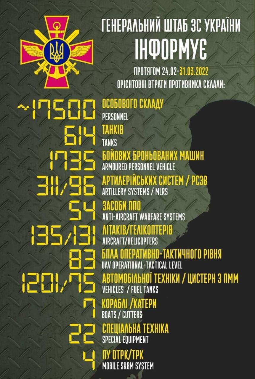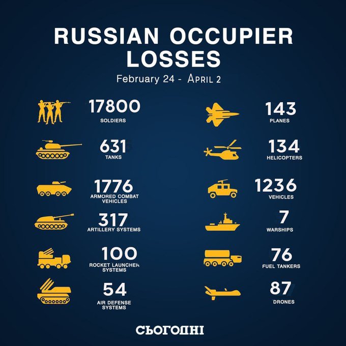 新‧二七部隊 軍事雜談 (New 27 Brigade) on Twitter4/4. 開戰至4/4日06:00為止,俄軍傷亡和損失統計