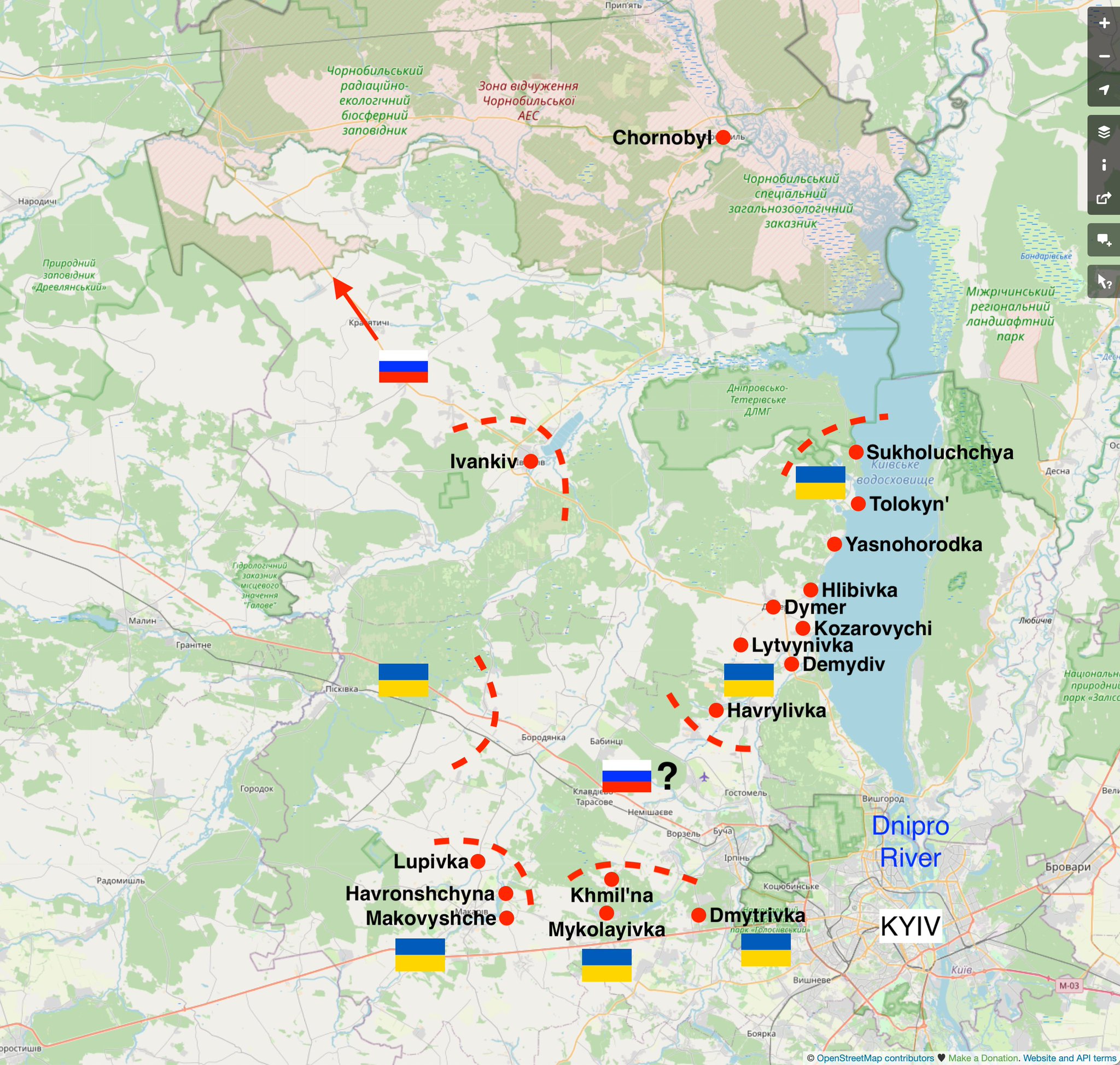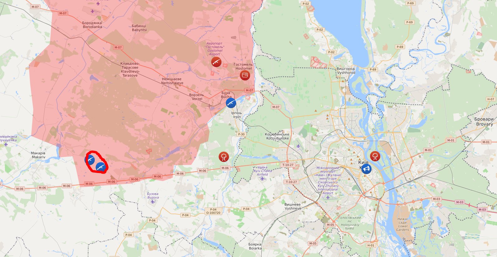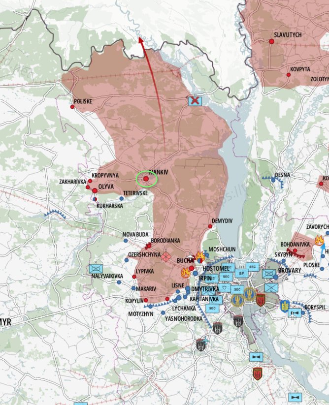 新‧二七部隊 軍事雜談 (New 27 Brigade) on Twitter3/28. 有關於烏克蘭軍方報告稱在伊萬科夫和奧拉內兩區發生俄軍向當地民眾乞求糧食的說法,在戰略上獲得證實,兩區在基輔西北部,已被烏軍斷絕補給線,俄軍陷入包圍的危機