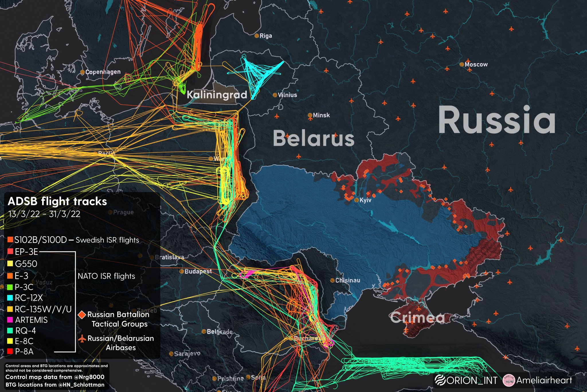 新‧二七部隊 軍事雜談 (New 27 Brigade) on Twitter4/4. 開戰以來北約和美軍在烏克蘭周圍的飛行軌跡,提供烏克蘭軍方長時間的敵情偵查