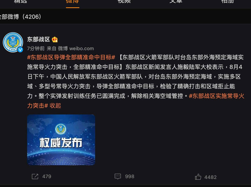 國防部證實:共軍下午1點56分起 於我東北、西南部海域發射多枚飛彈