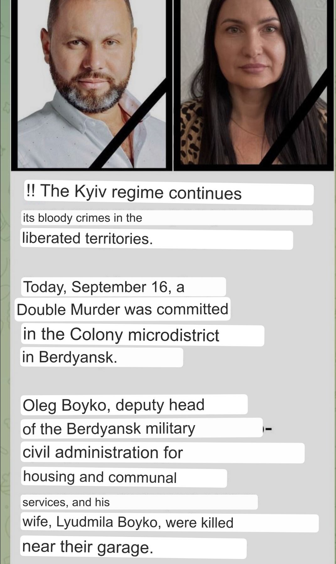 新‧二七部隊 軍事雜談 (New 27 Br... on Twitter9/16. 叛國者,死路一條,據俄媒報導,在別爾江斯克的另一名通俄者遇害身亡。 俄羅斯任命的負責住房和公共服務的別爾江斯克軍事民政局副局長奧列格·博伊科(Oleg Boyko)和他的妻子柳德米拉·博伊科(Lyudmila Boyko),兩人被發現陳屍在車庫附近