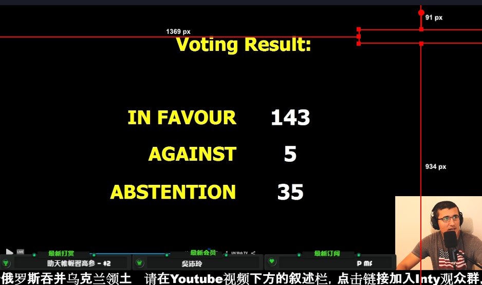 143國同意! 聯大譴責俄羅斯非法併吞烏克蘭領土 中國棄權 - 國際 - 自由時報電子報在此次關於烏克蘭問題的緊急會議中,聯合國大會193個成員國中有143國投下同意票支持譴責俄國非法行為,另有5國反對、35國棄權,其餘國家則沒有投。會議中以壓倒性票數通過決議