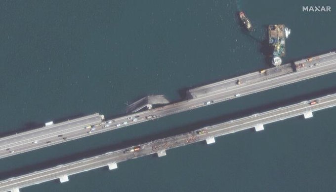 新台灣國防軍事網 on Twitter更多克里米亞大橋的新影片曝光,可惜此次爆炸沒有讓橋梁完全斷裂。公路橋還是能單線通車