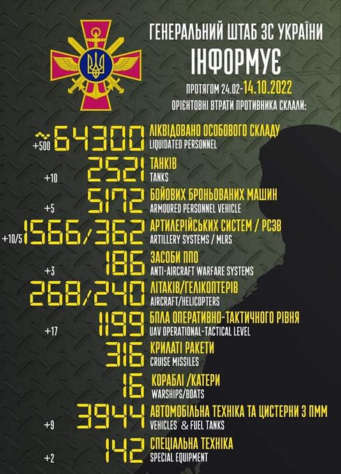 新‧二七部隊 軍事雜談 (New 27 Brigade) on Twitter10/14. 開戰至10/14日06:00為止俄軍傷亡和損失統計