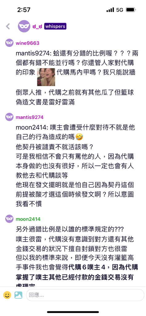 當初事情發生時如果噗主發這篇,我覺得沒問題,那時觀看者們沒有現在籃球那件事的既定印象。可現在因為籃球事件,代購簡直變過街老鼠,噗主這件事的過錯比例明明是他7代購3,結果下面清一色全部都是什麼 噗主有錯啦但是代購更雷????